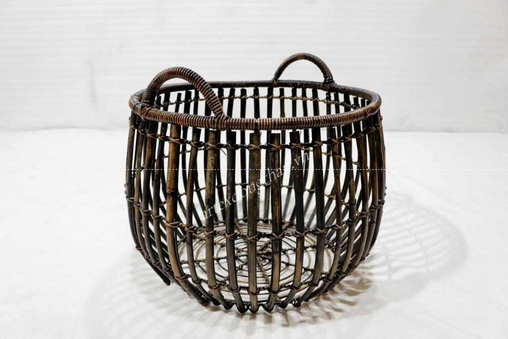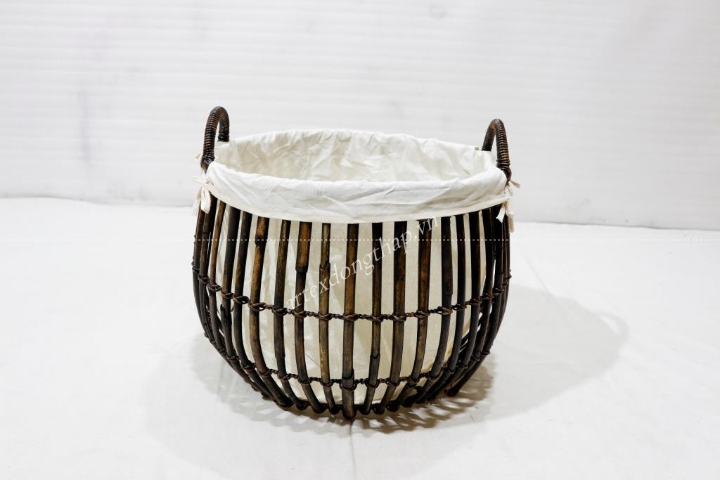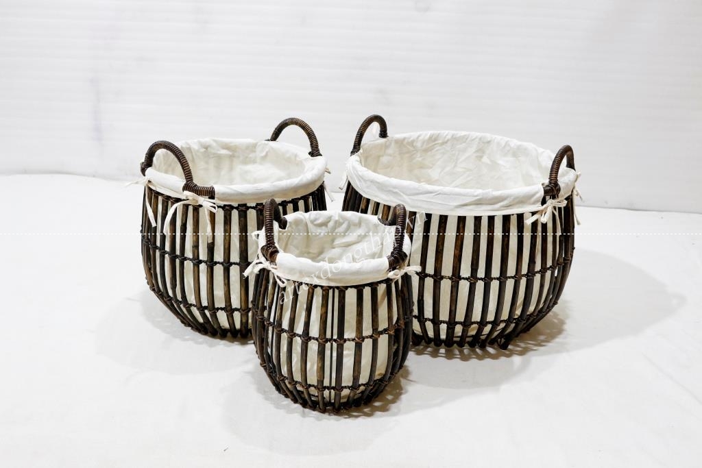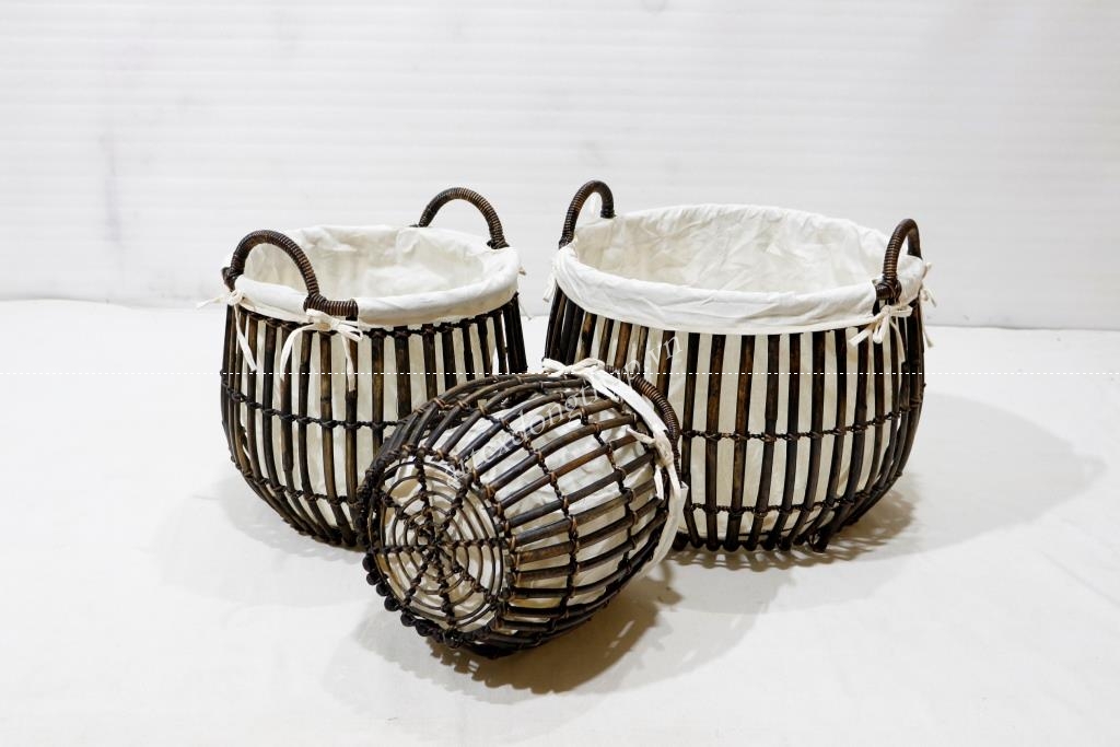 Description: Set of 3 round bamboo baskets, iron frame with semicircular handles, open weave, black color, with fabric liner inside.