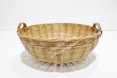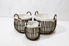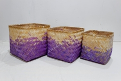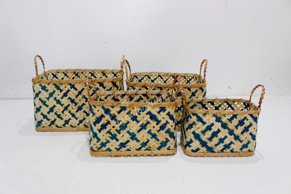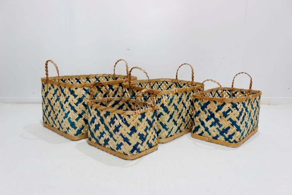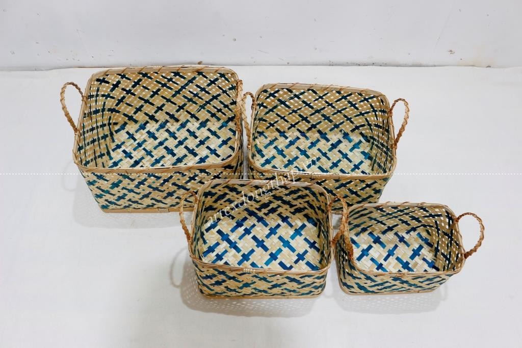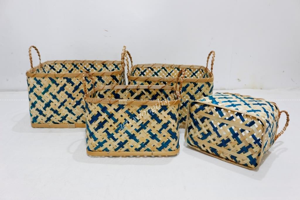 Description: Set of 4 rect bamboo baskets, unframe, with half round handles, natural mix blue color.