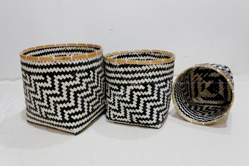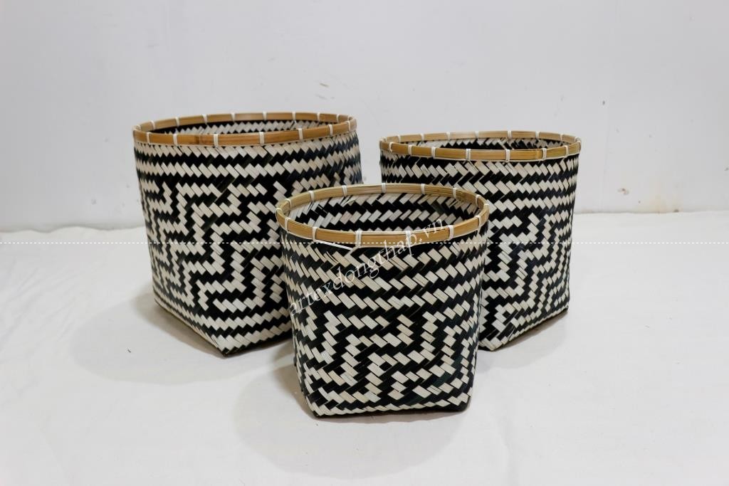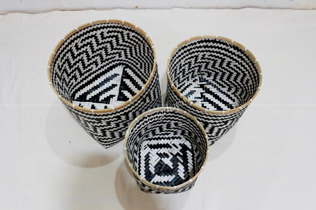 Description: Set of 3 round top and bottom bamboo baskets, unframe, natural mix black color.