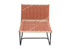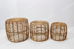 Description: Set of 3 round rattan stools, iron frame, open weave, natural color