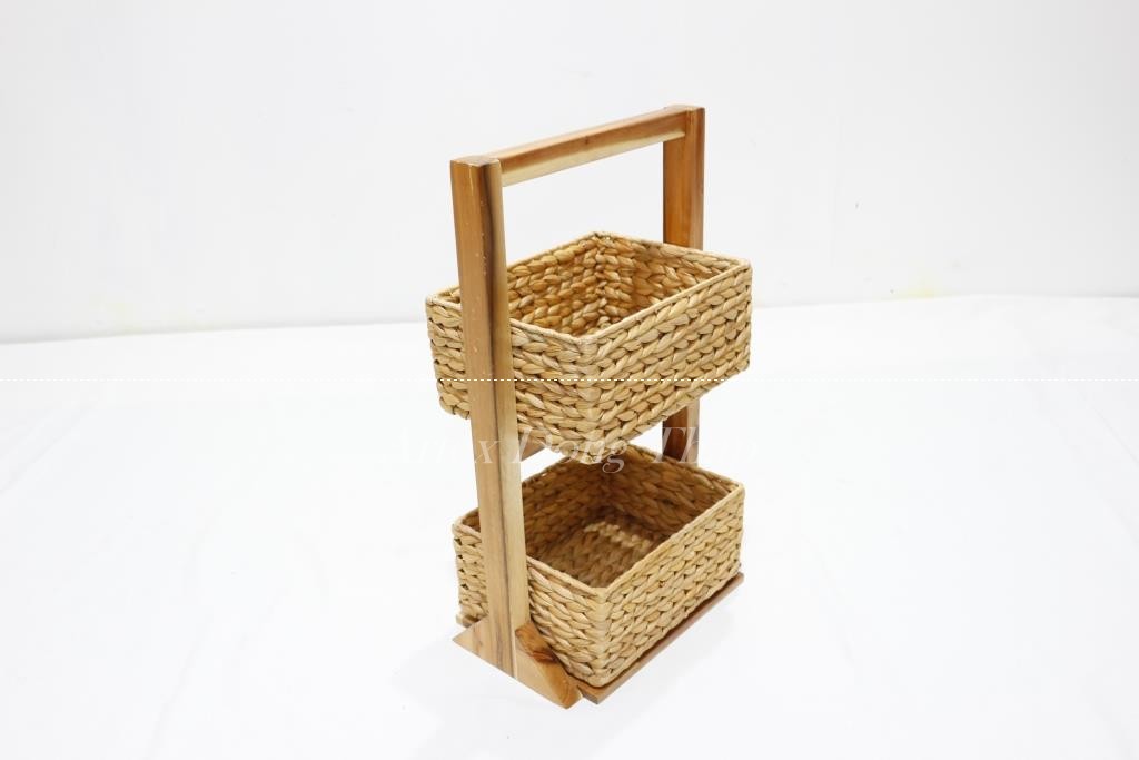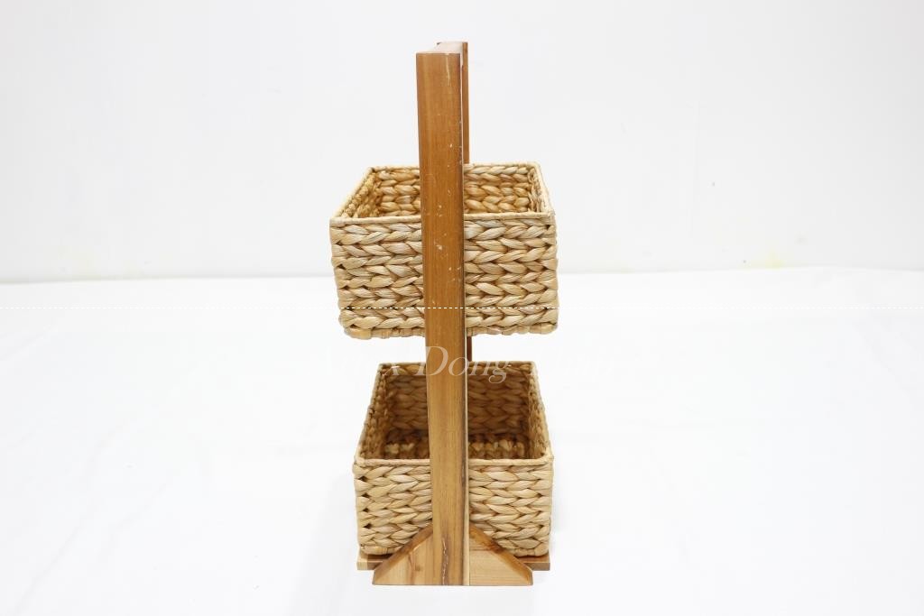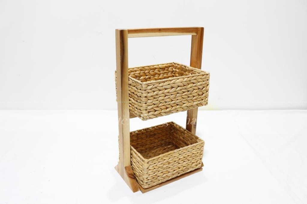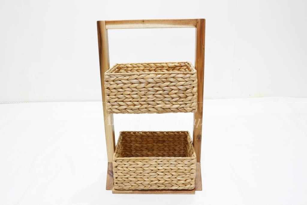 Description: Wooden Magazine rack in natural color with 2 water hyacinth baskets