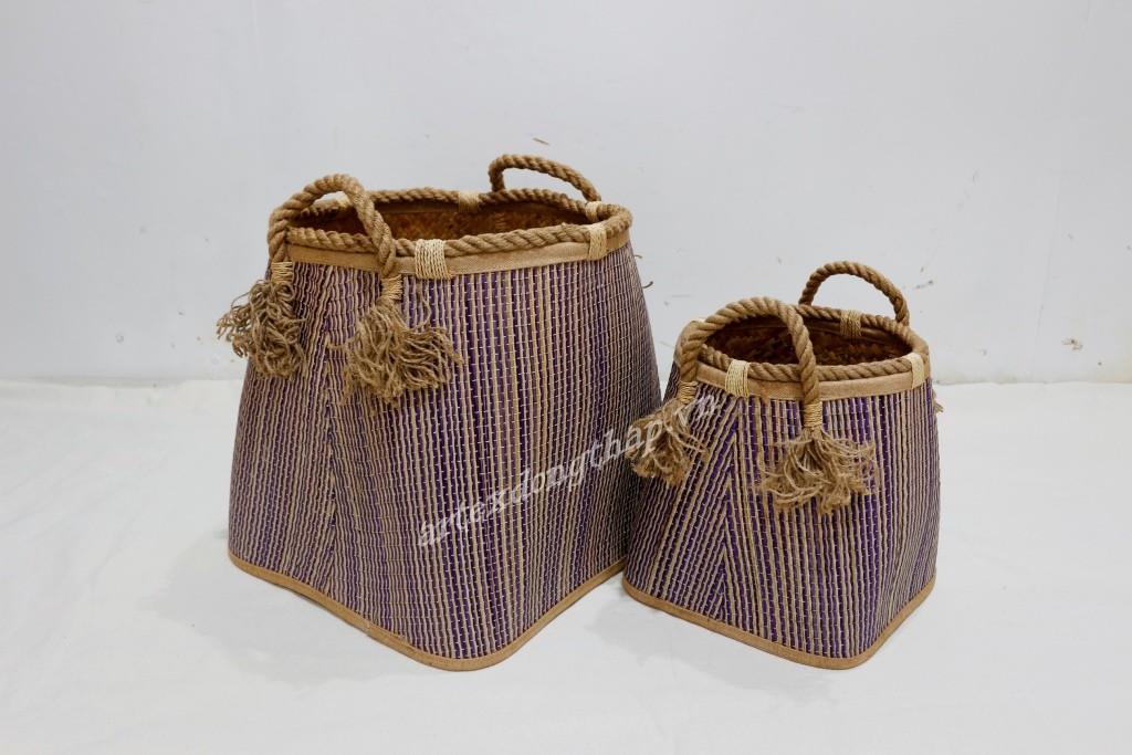 Set of 2 round top and square bottom palm leaf baskets, unframe with burlap rim and bottom, semicircular rope handles, natural mix purple color as picture