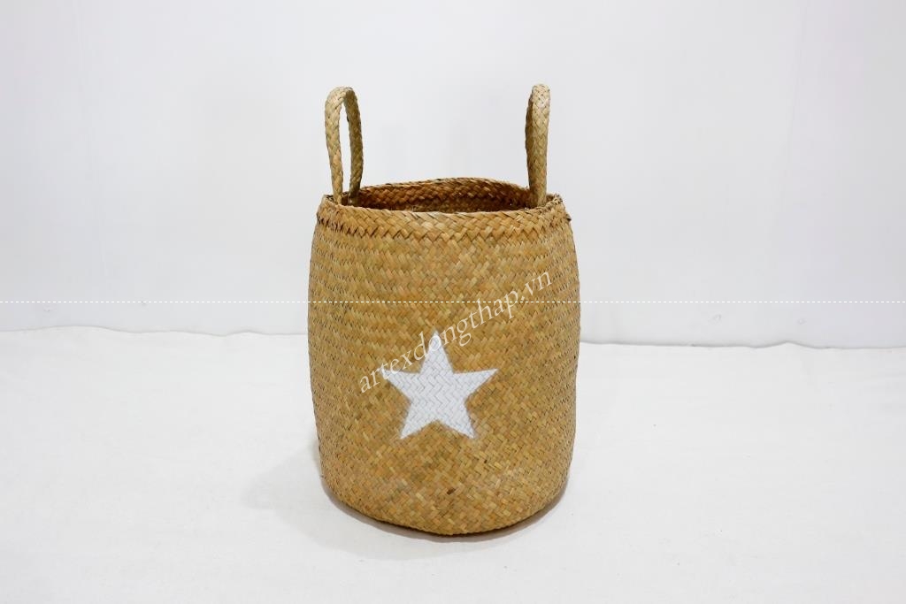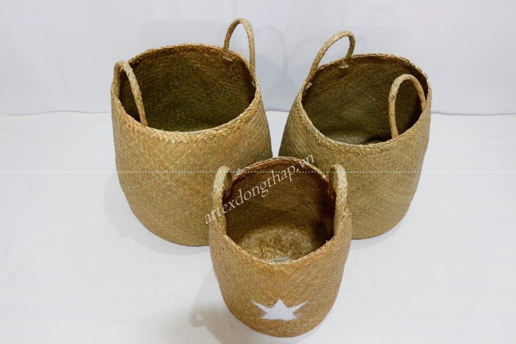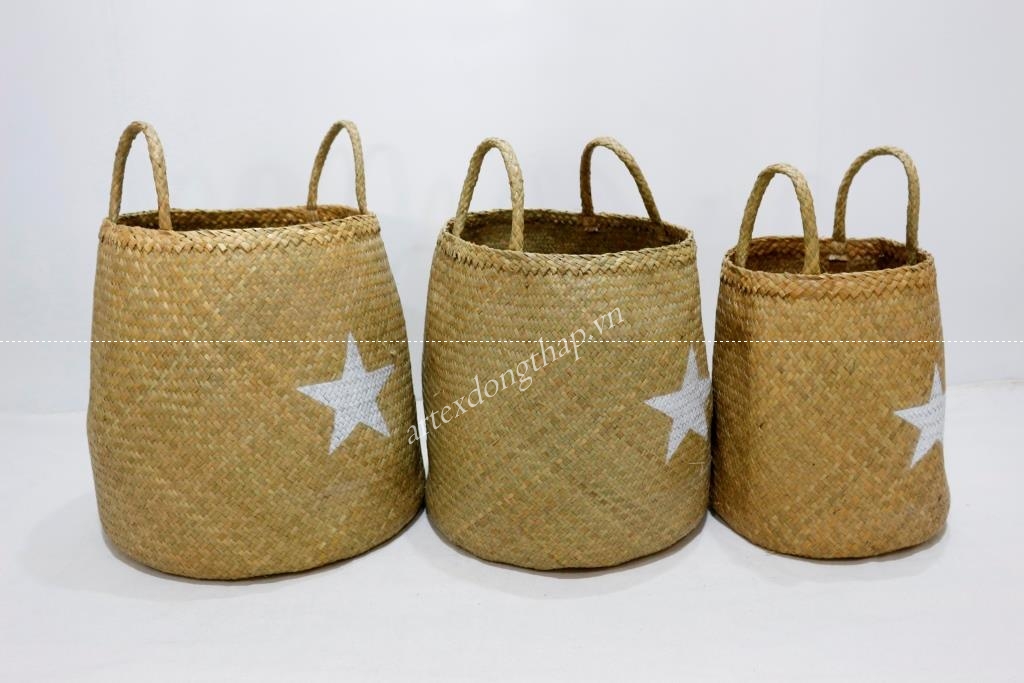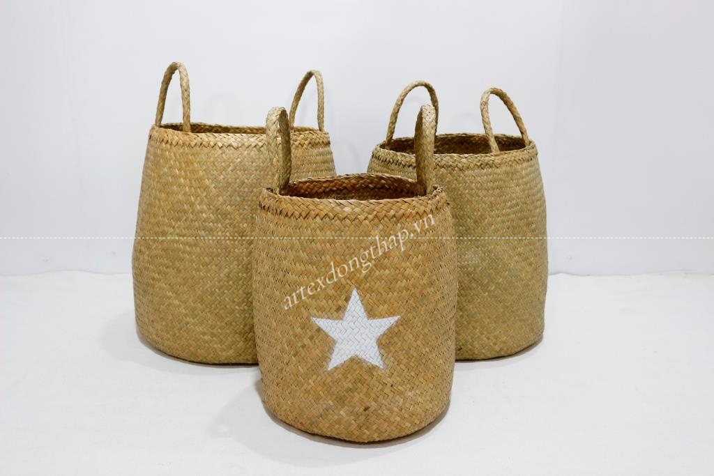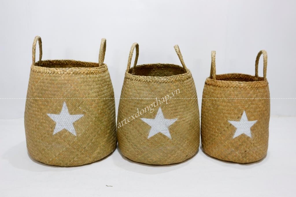 Set of 3 round palm leaf baskets, unframe with semicircular handles, natural color, with star decor as picture.