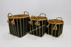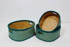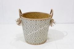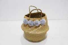 Round palm leaf folding basket, plump body, semicircular handles with pom pom as picture, natural color