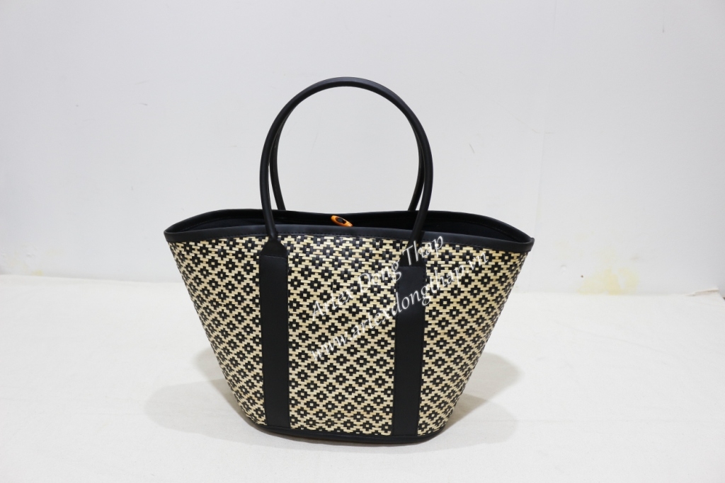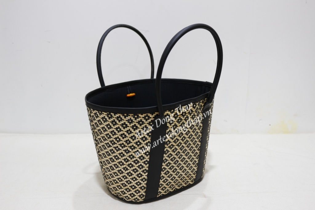 Oval palm leaf handbag, unframe with black simili handles, natural mix black color as picture, fabric liner inside.