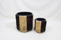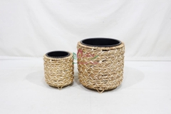 Set of 2 round water hyacinth planters, twisted weave, natural mix black color, black plastic pots inside.