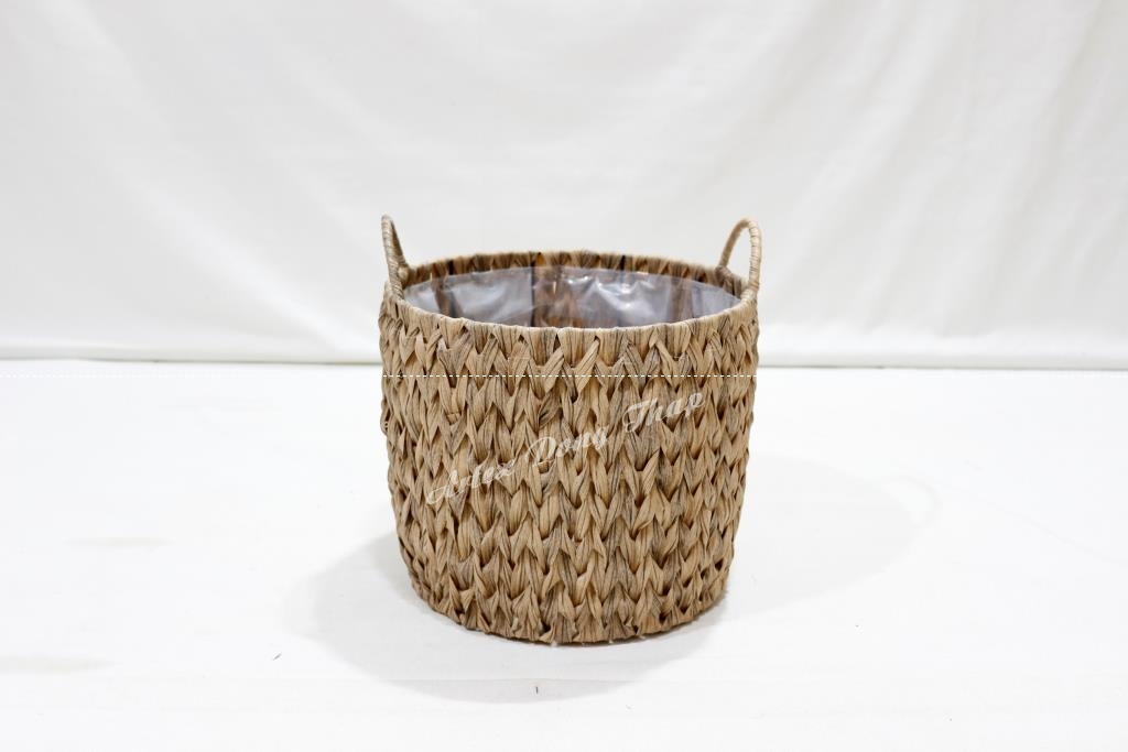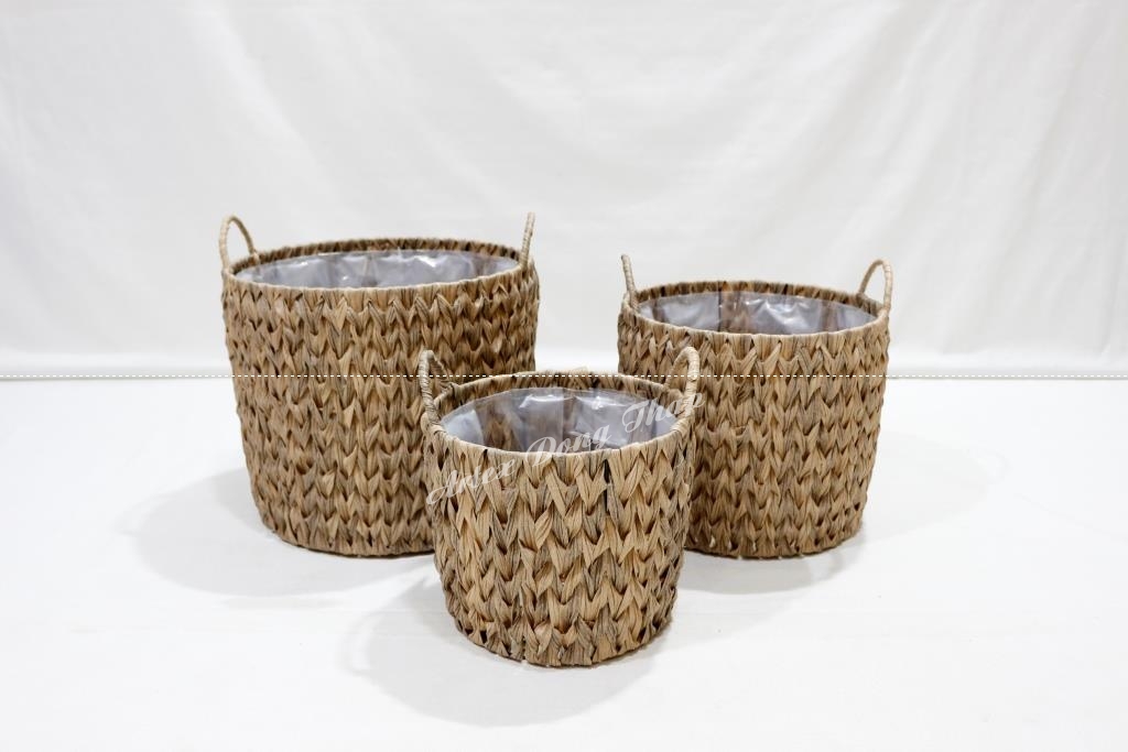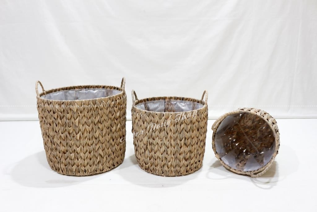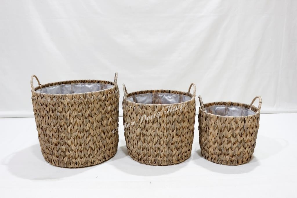 Description: Set of 3 round poly rattan baskets, iron frame with half round handles, fish bone weave with flat wicker, brown color. PE lỉner inside.