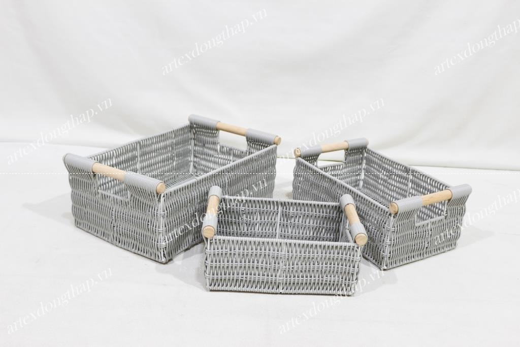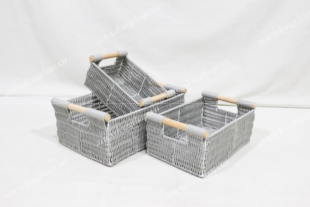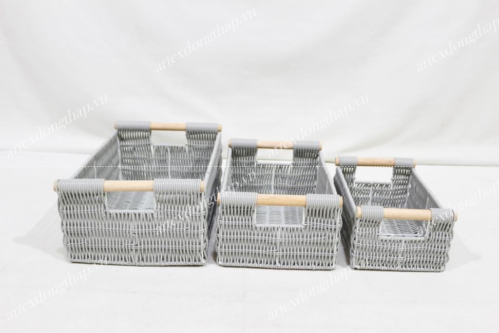Description: Set of 3 rectangle poly rattan baskets, iron frame with wood handles, normal weave, grey color