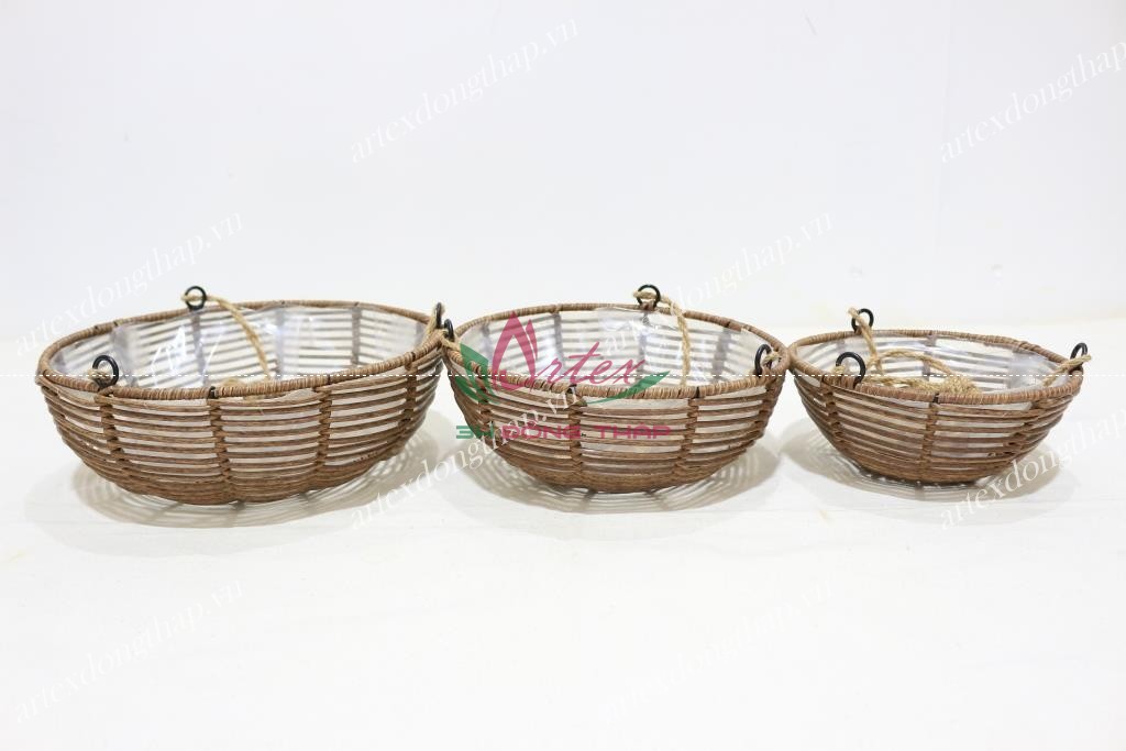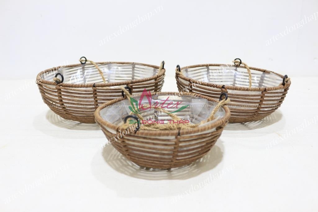Description: Set of 3 round poly rattan hanging planters, iron frame with rope handles, open weave, brown color, PE liner inside