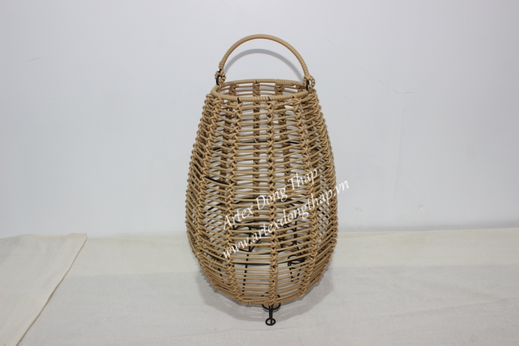 Poly rattan lantern, shape as picture, iron frame with folding handle, open weave, round wicker, beige color.