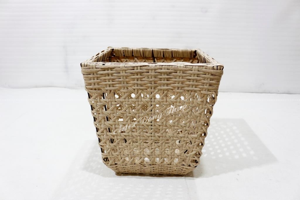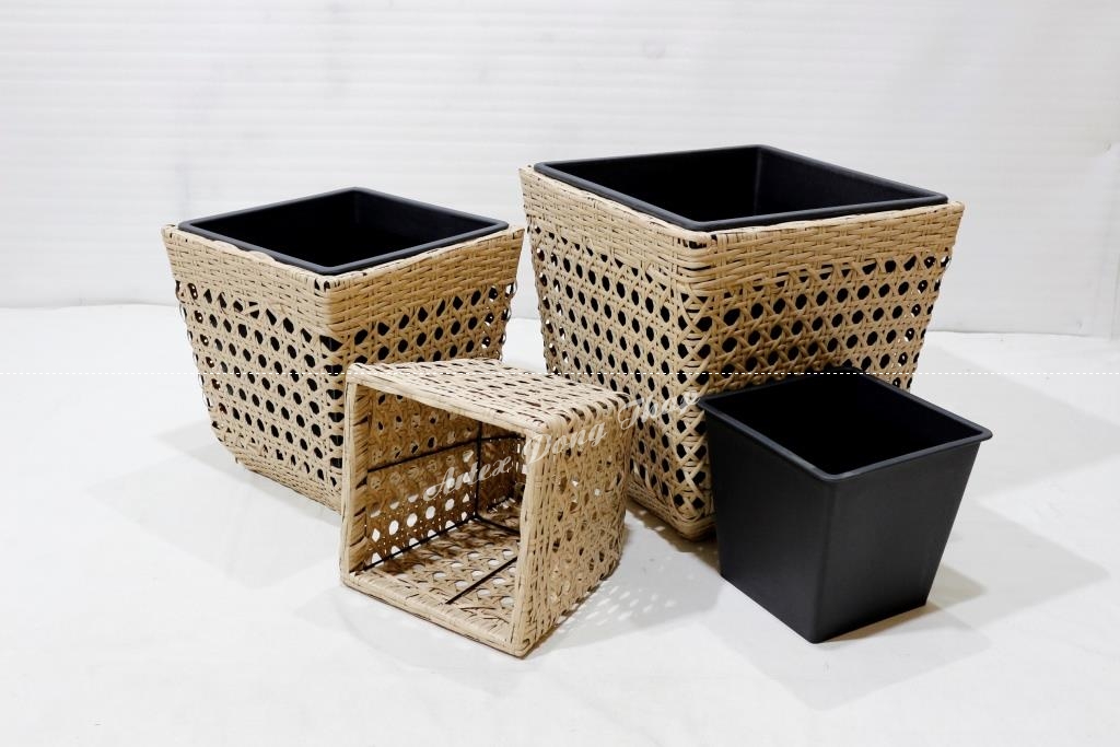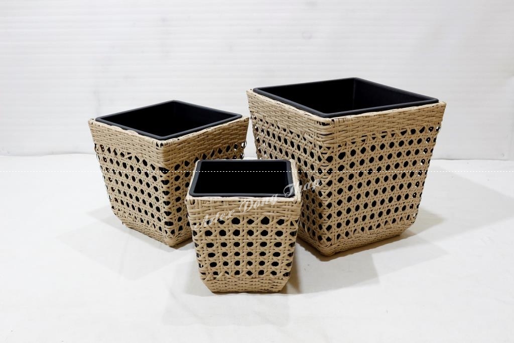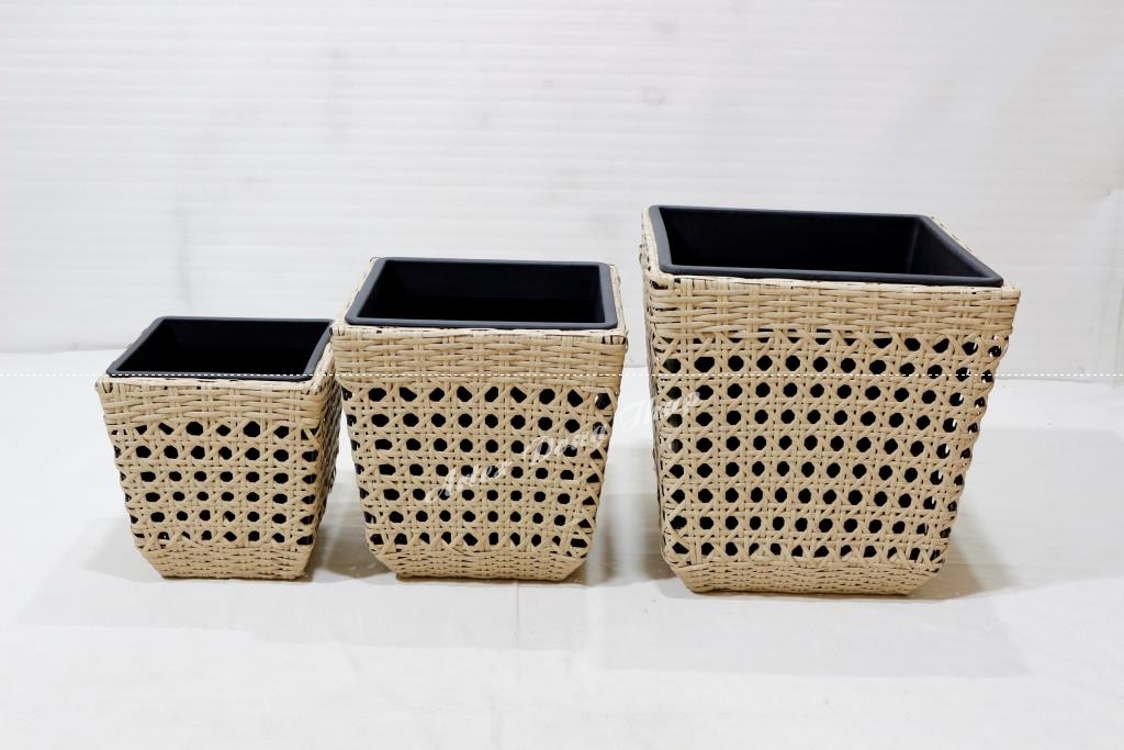 Set of 3 square poly rattan planters, iron frame, tapered bottom, half round wicker, yellow color, black plastic pot inside.