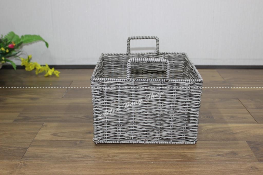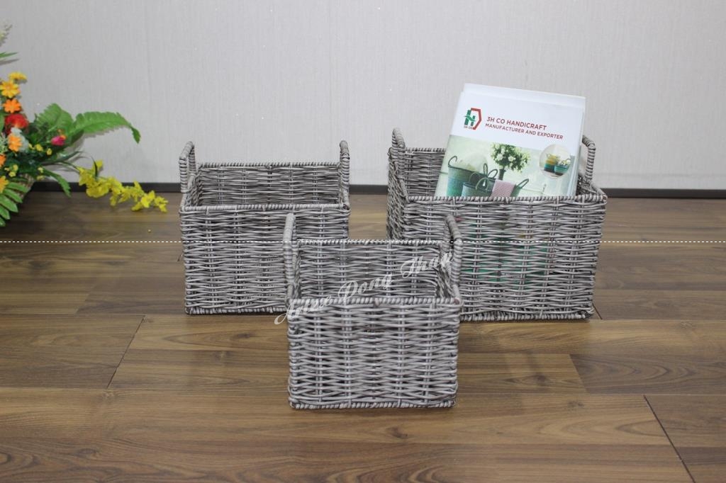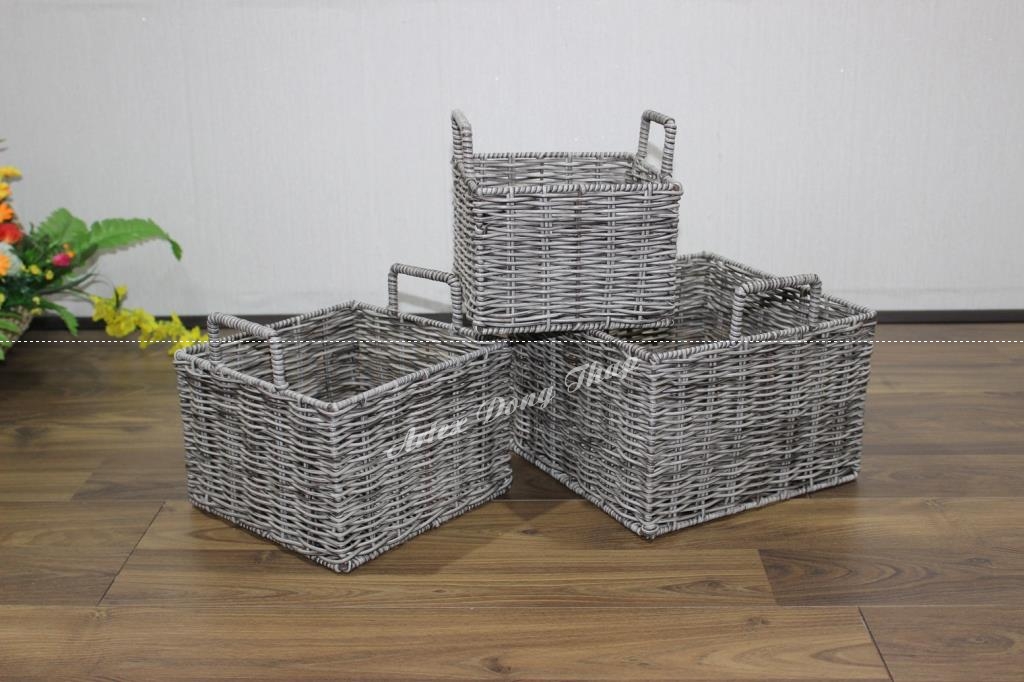 Set of 3 rect poly rattan trays, iron frame, U-shape handles, normal weave, grey color.