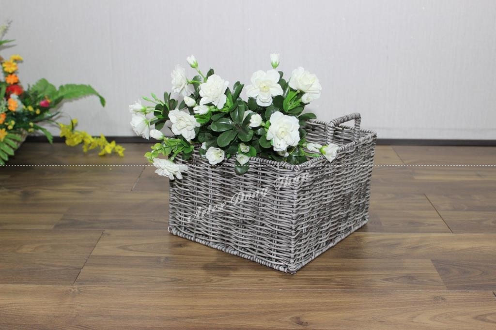 Set of 3 rect poly rattan trays, iron frame, U-shape handles, normal weave, grey color