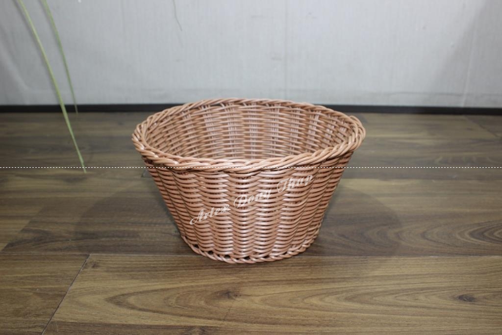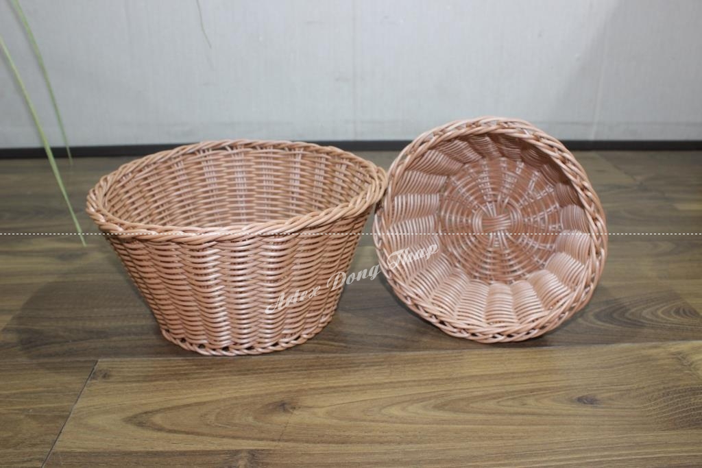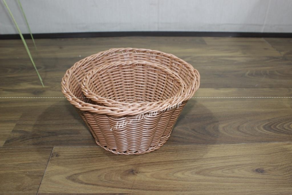 Set of 2 round poly rattan trays, unframe with tapered bottom, normal weave, brown color.