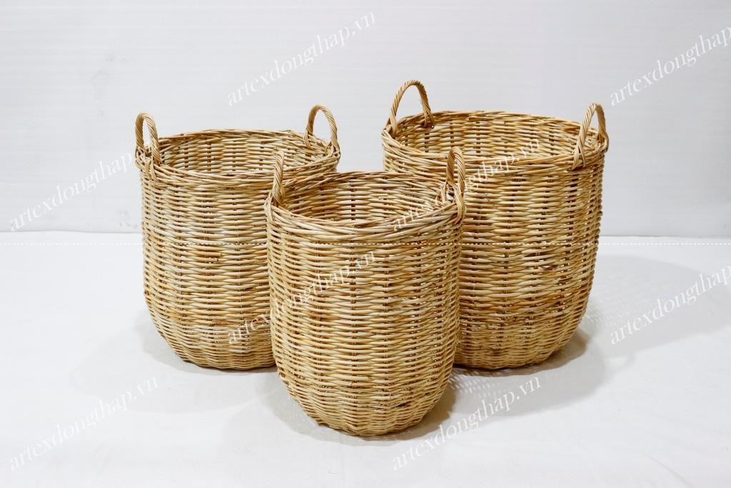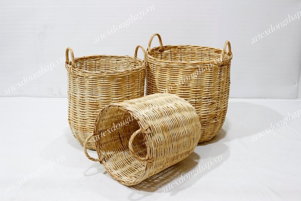 Description: Set of 3 round rattan baskets, unframe with semicircular handles, normal weave, natural color