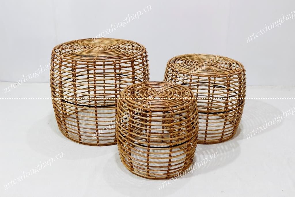 Description: Set of 3 round rattan stools, iron frame, open weave, natural color