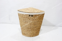 Rect water hyacinth laundry basket, iron frame with attached lid, fish bone weave, natural color, fabric liner inside.
