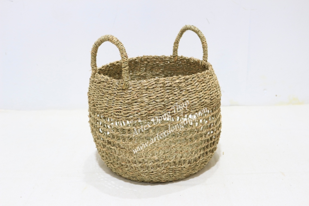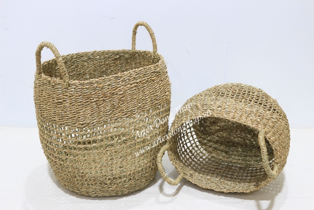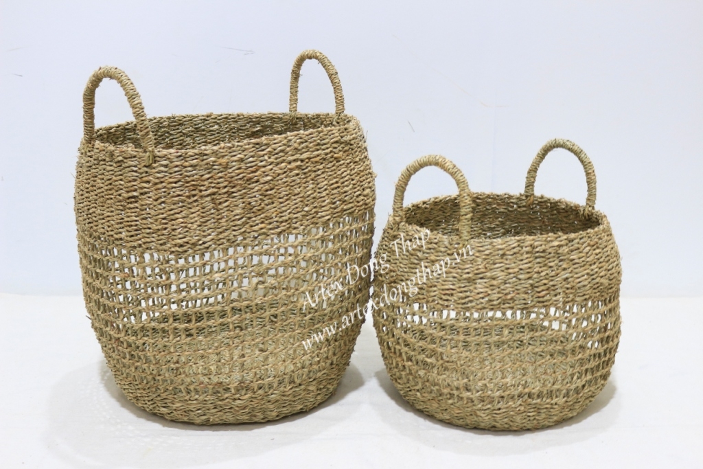Set of 2 round seagrass baskets, unframe with semicircular handles, normal weave, natural color.