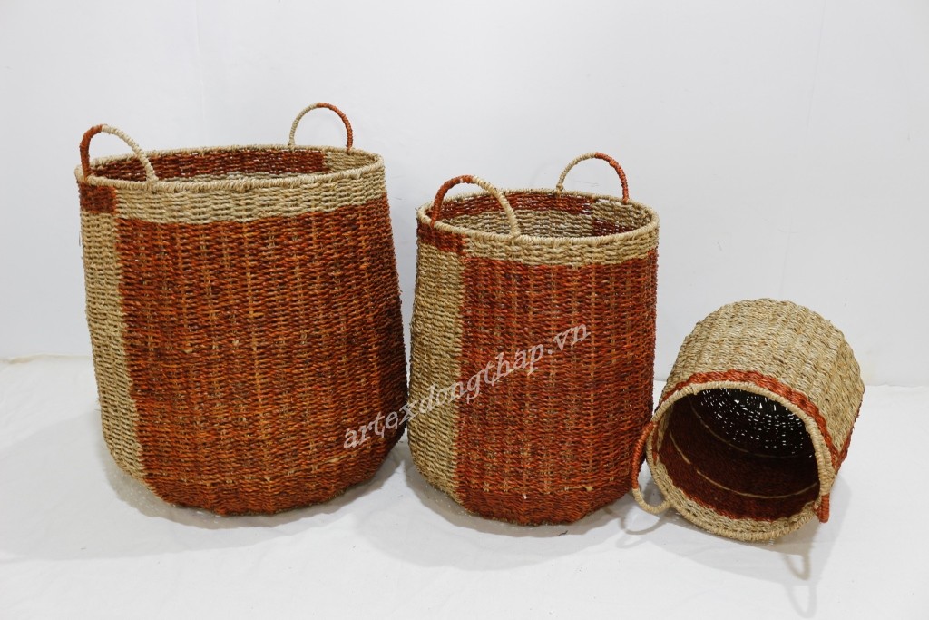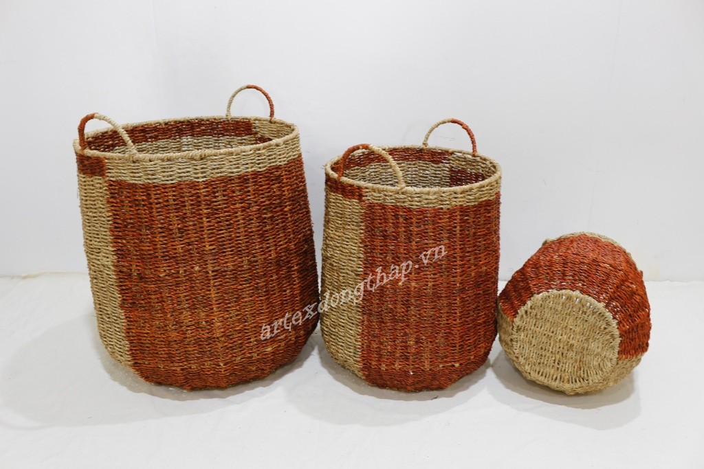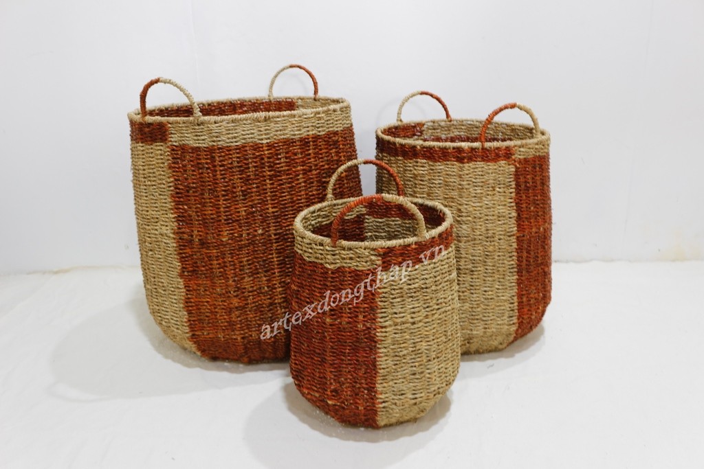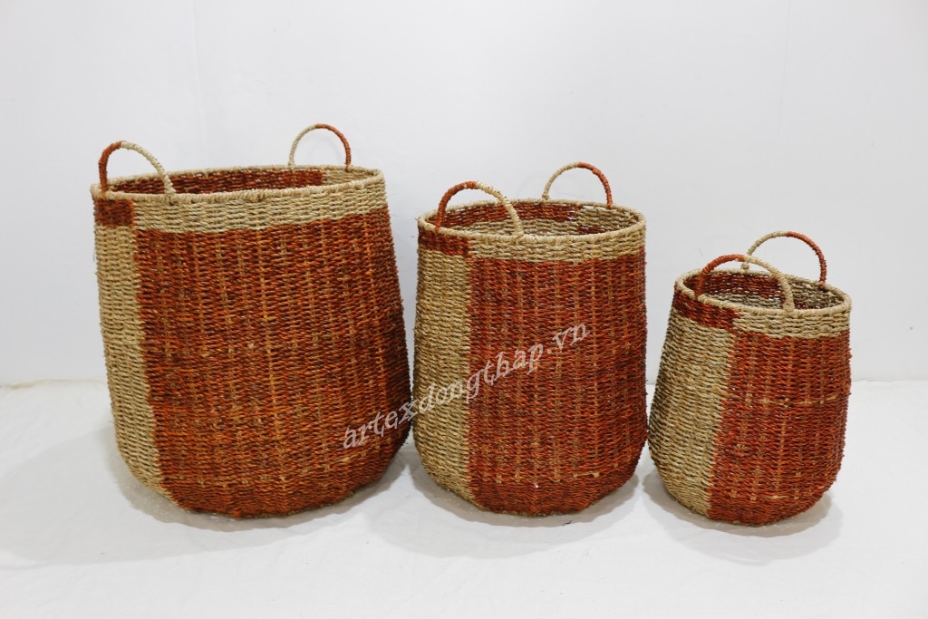 Set of 3 round seagrass baskets, iron frame with half round handles, normal weave, natural mix orange color as picture.