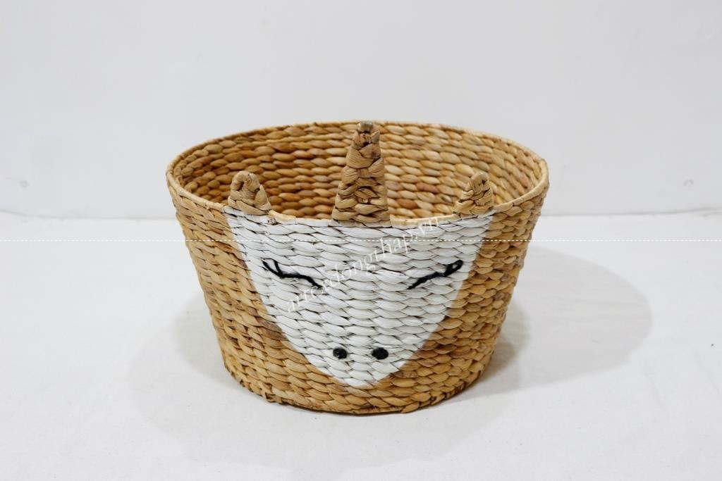 Water hyacinth animal basket, iron frame with Unicorn shape, rice nut weave, natural mix white color.