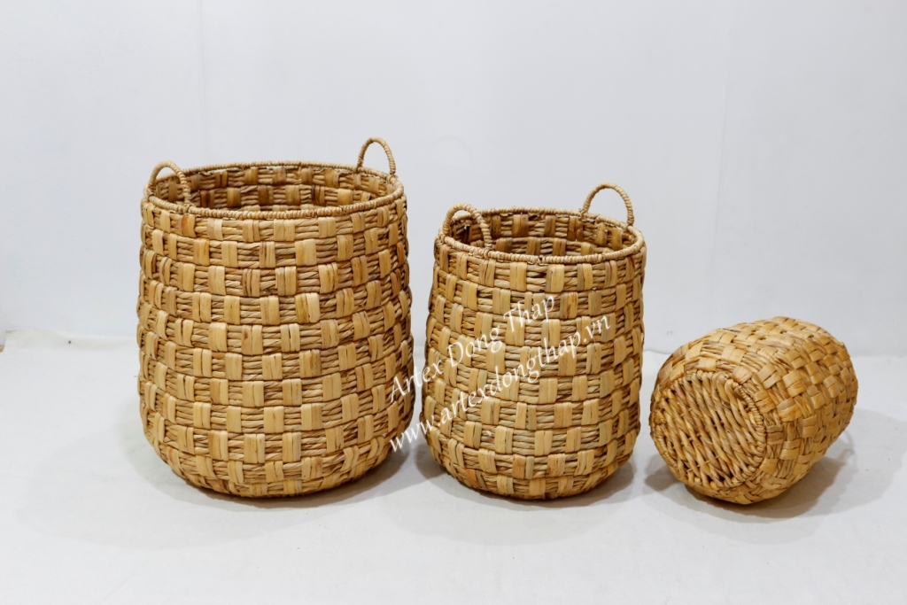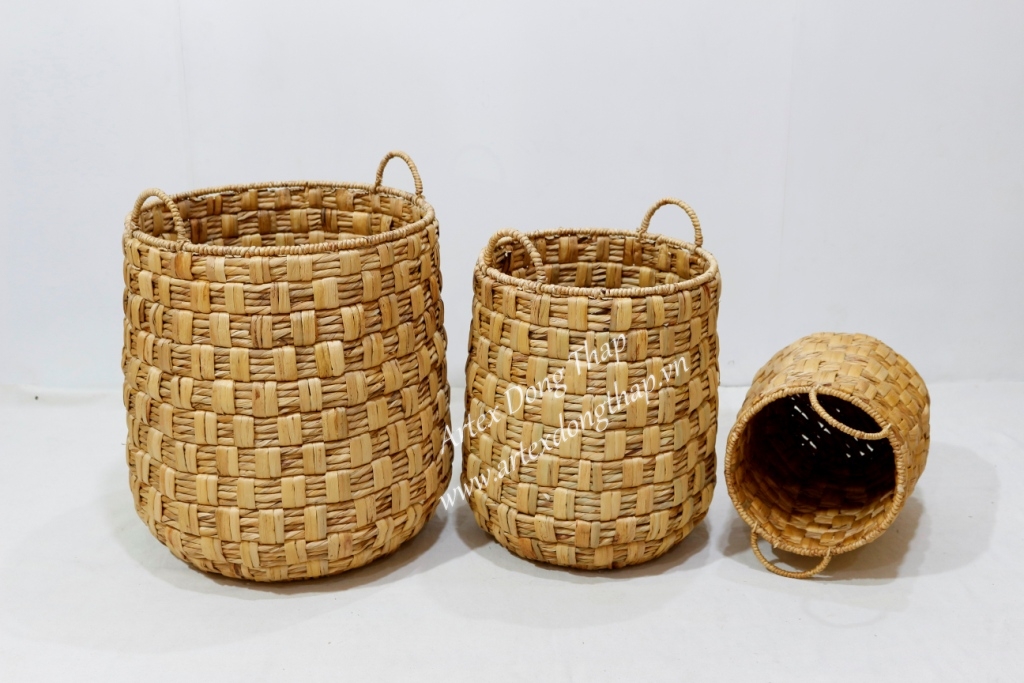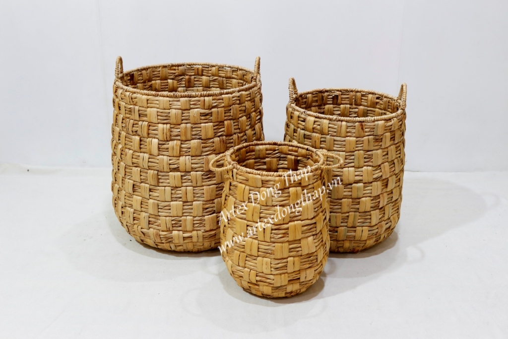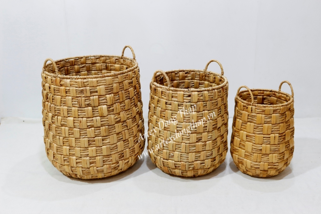 Set of 3 round water hyacinth baskets, iron frame with semicircular handles, twisted weave mix flat weave, natural color