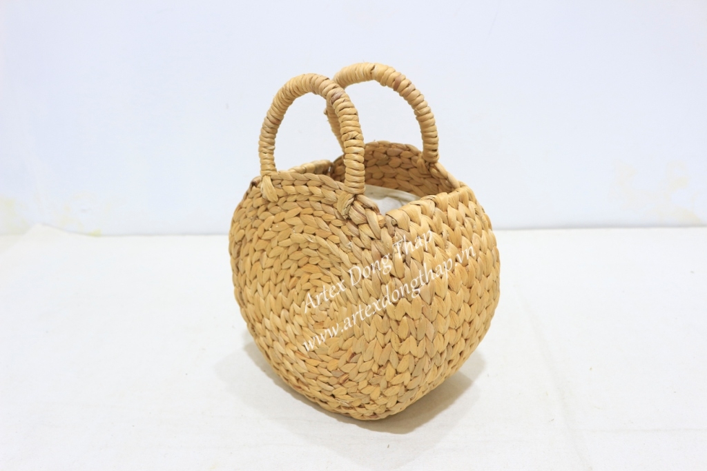 Round water hyacinth handbag, unframe with semicircular handles, fish bone weave, natural color with white fabric liner inside
