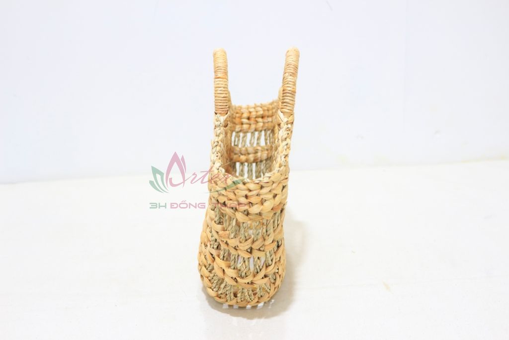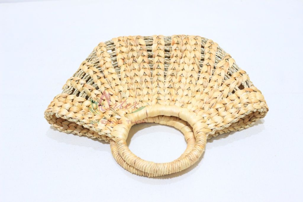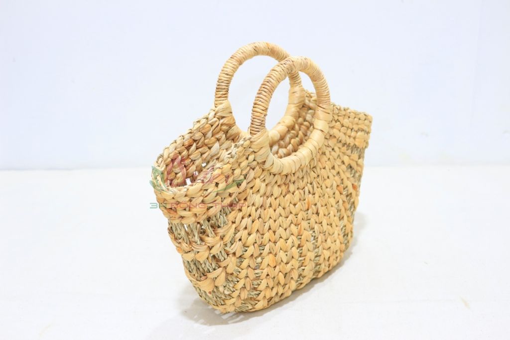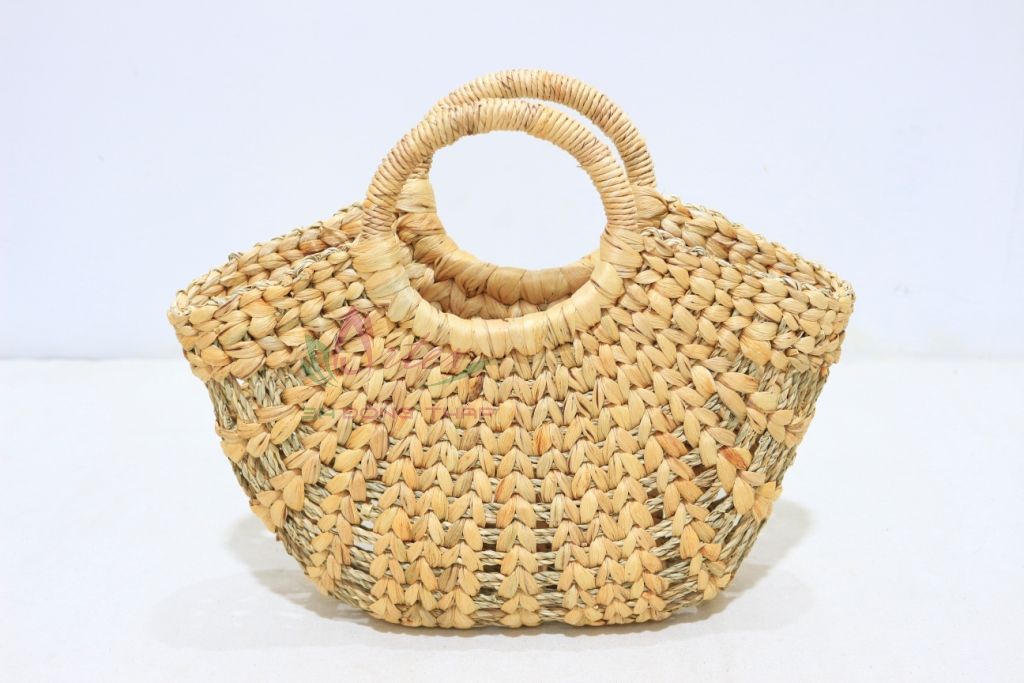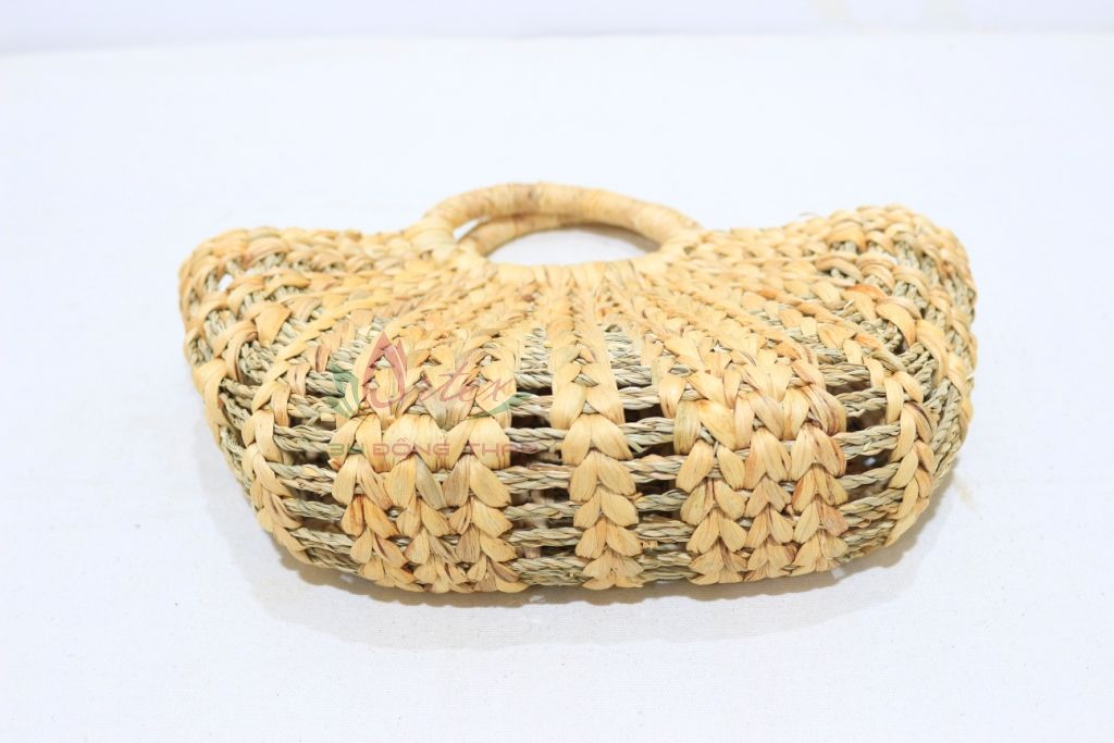 Description: Oval water hyacinth handbag, unframe with round handle, fishbone weave, natural color