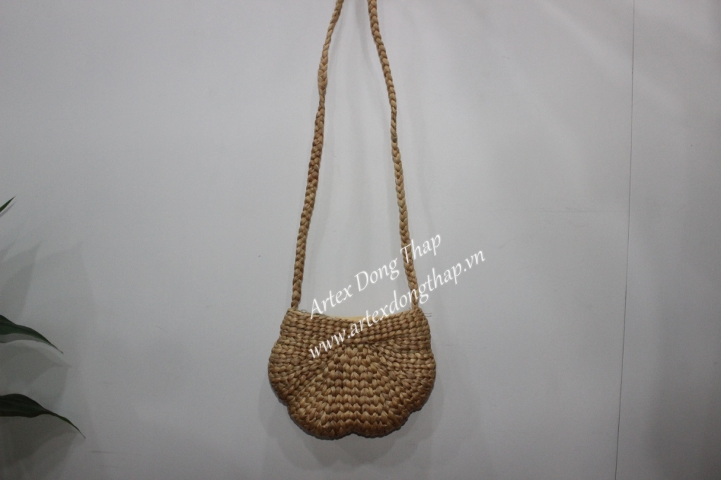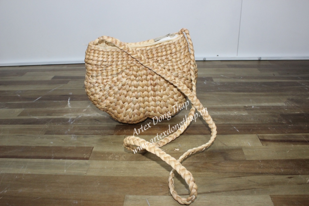 Description: Water hyacinth handbag, unframe with braided handle, rice nut weave mix fish bone weave, natural color, with grey fabric liner with zipper