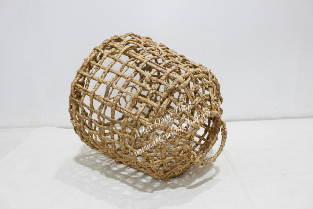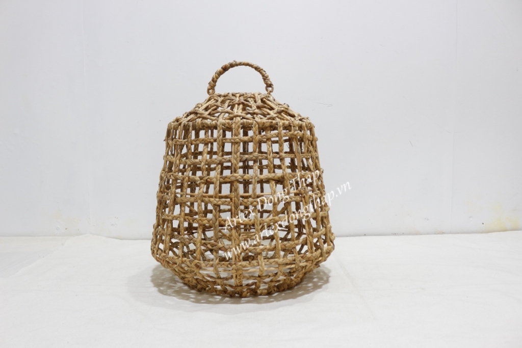 Water hyacinth lantern, shape as picture, iron frame with folding handle, open karo weave, natural color.