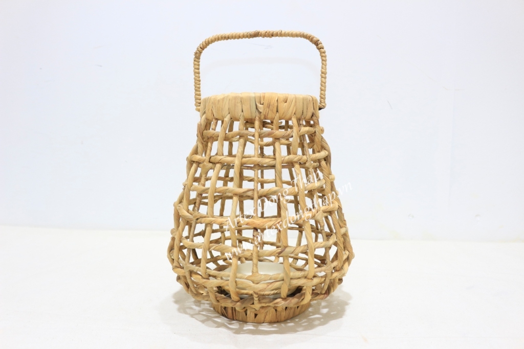 Water hyacinth lantern, shape as picture, iron frame with folding handle, open karo weave, natural color.