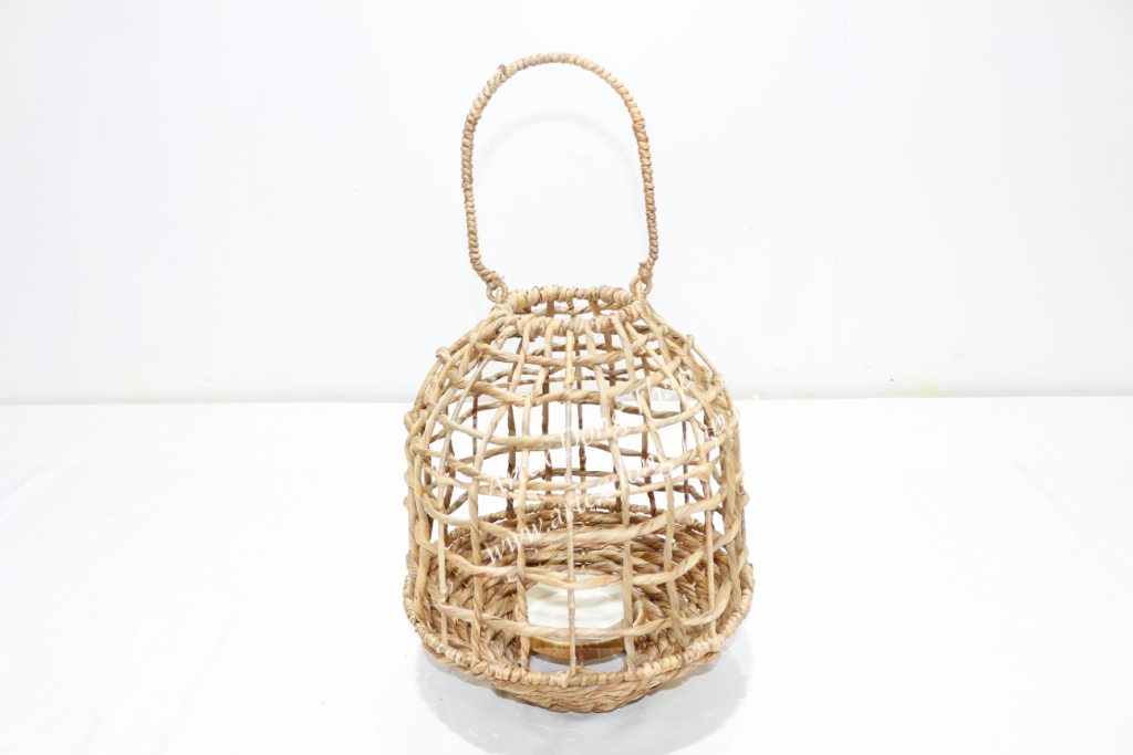 Water hyacinth lantern, shape as picture, iron frame with folding handle, open karo weave, natural color.