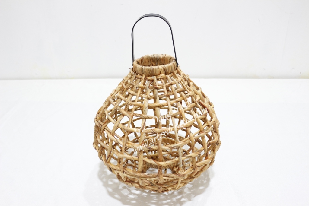 Water hyacinth lantern, shape as picture, iron frame with metal folding handle, open karo weave, natural color.