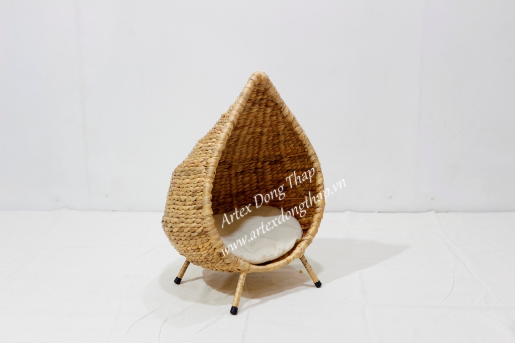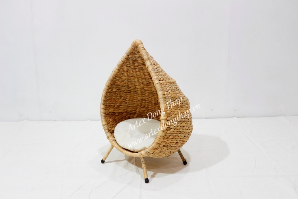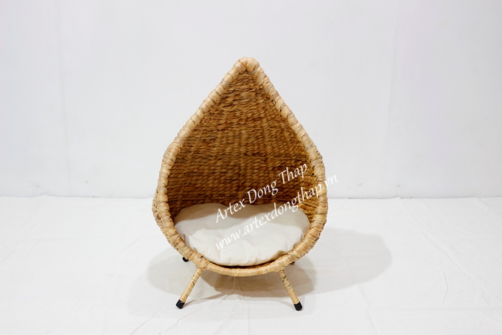 Water hyacinth pet bed, iron frame with 4 legs, rice nut weave, natural color, with white cushion inside