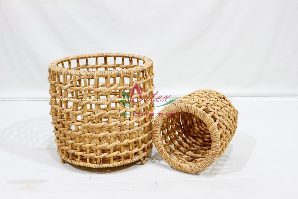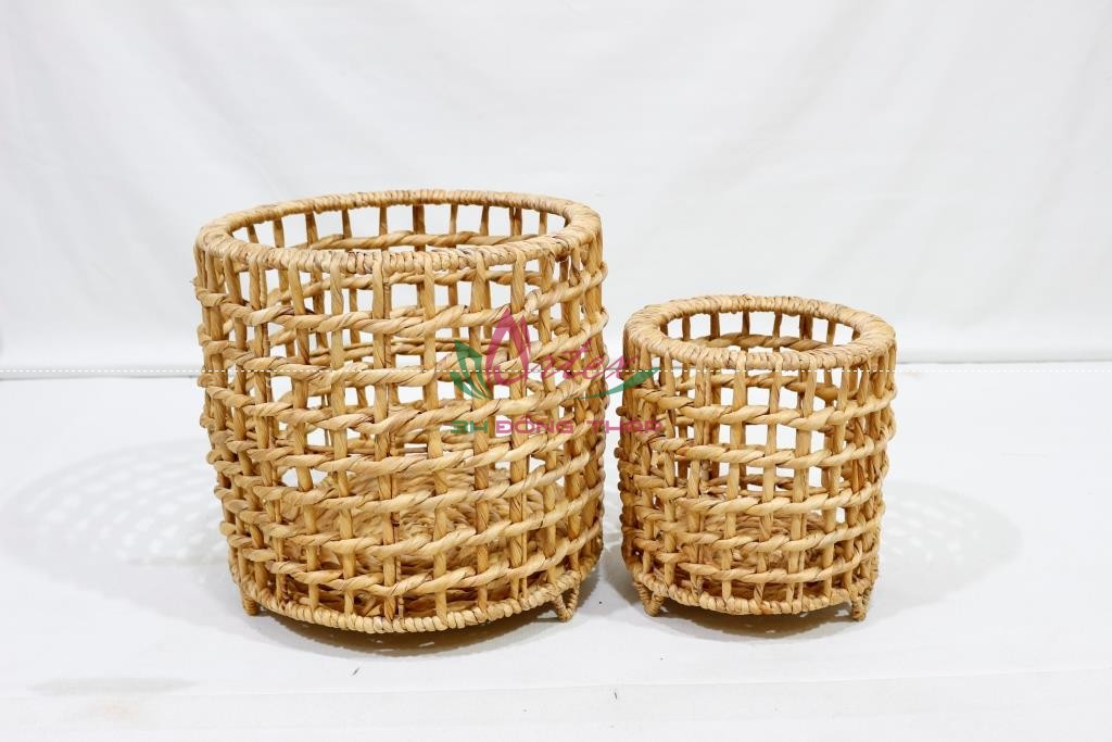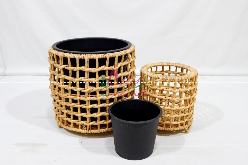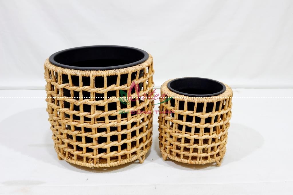 Set of 2 round water hyacinth planters, open karo weave, natural color, black plastic pots inside.