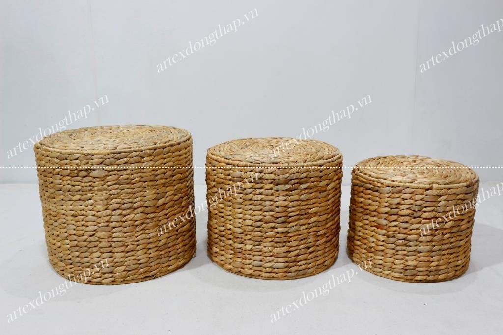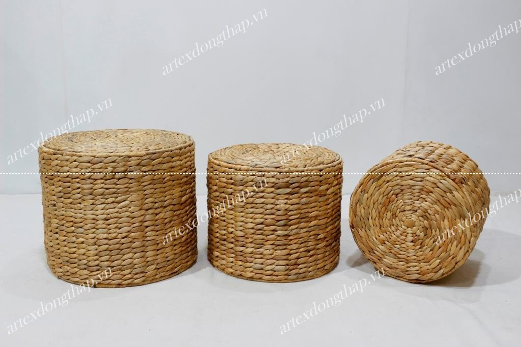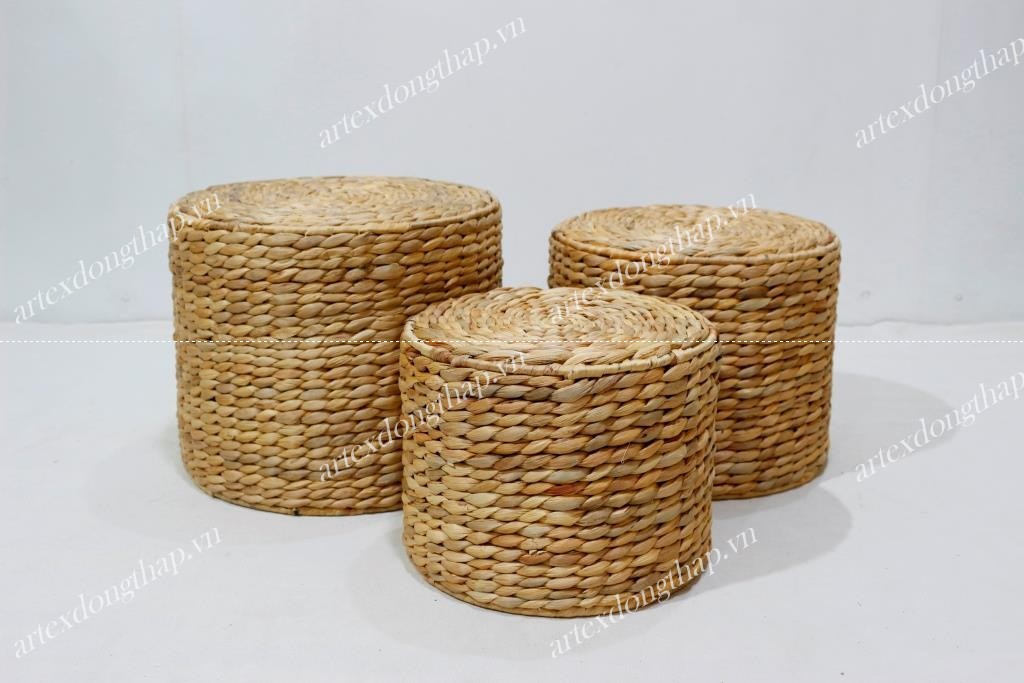 Description: Set of 3 round water hyacinth stools, iron frame, rice nut weave, natural color