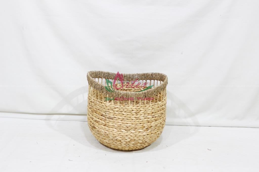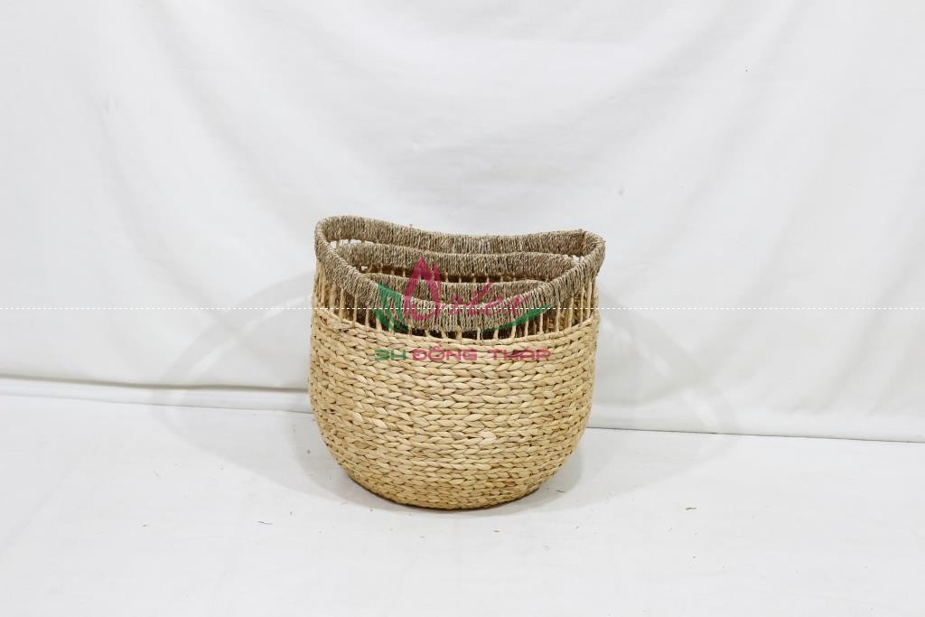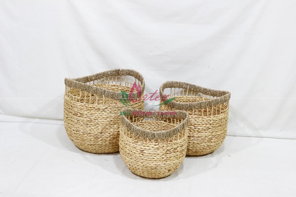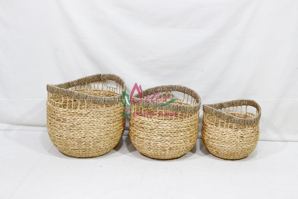 Set of 3 rect water hyacinth baskets, iron frame with seagrass double rim, fish bone weave, natural color
