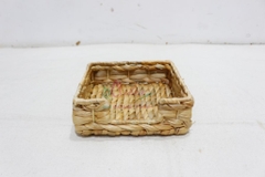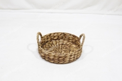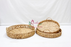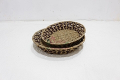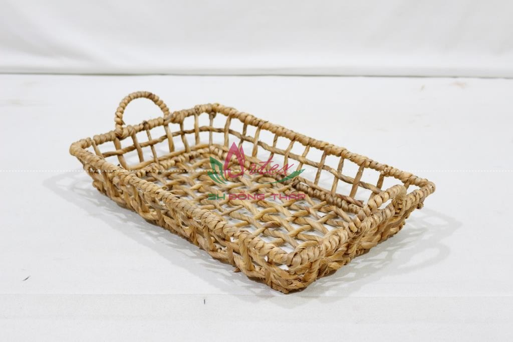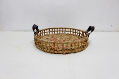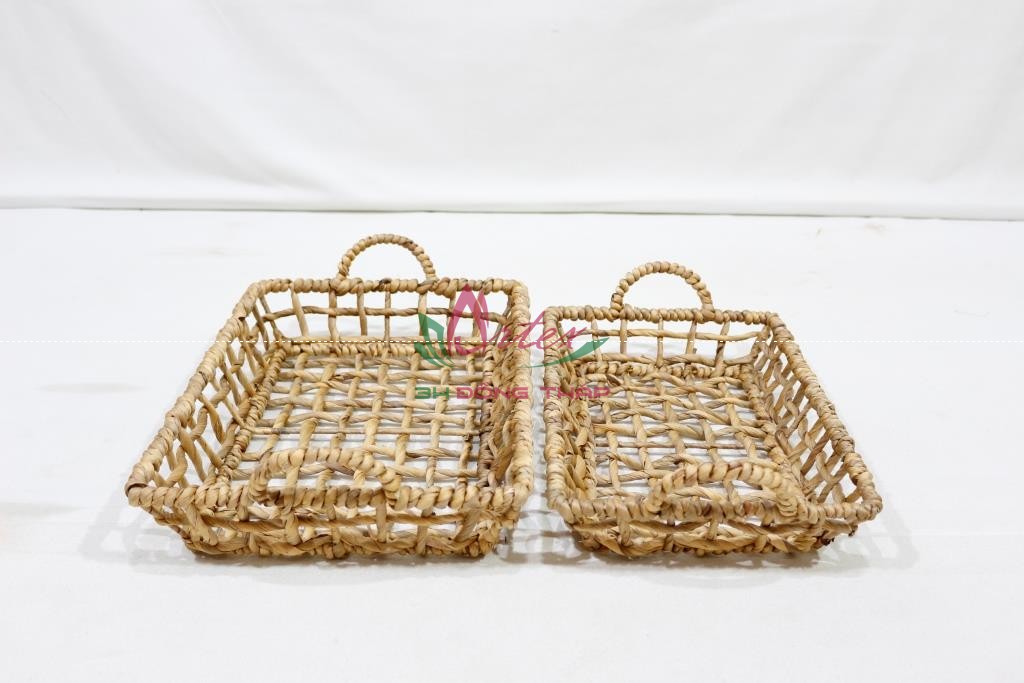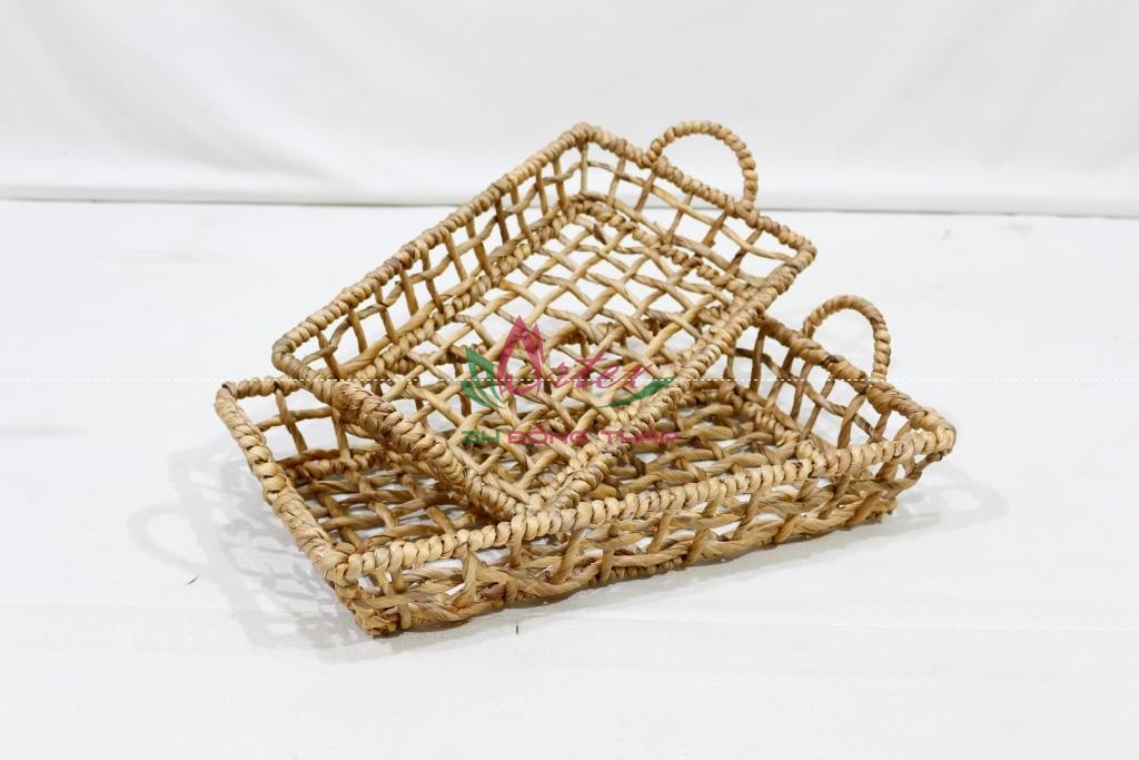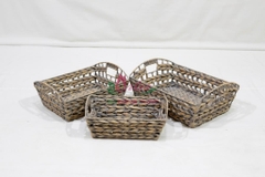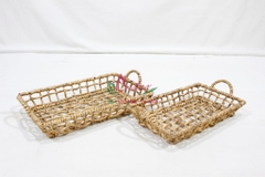 Set of 2 rectangle water hyacinth trays, iron frame with semicircular handles, open karo weave, natural color