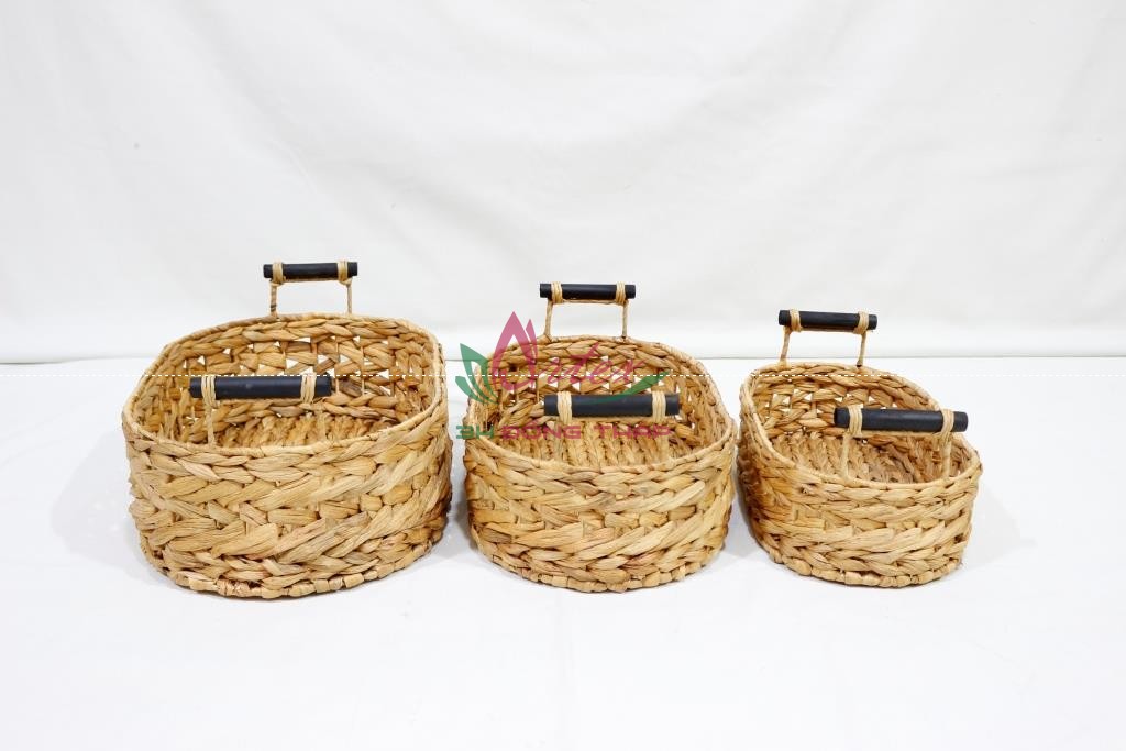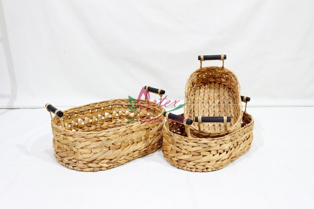 Set of 3 oval water hyacinth trays, iron frame with wood handles, ziczac weave, natural color