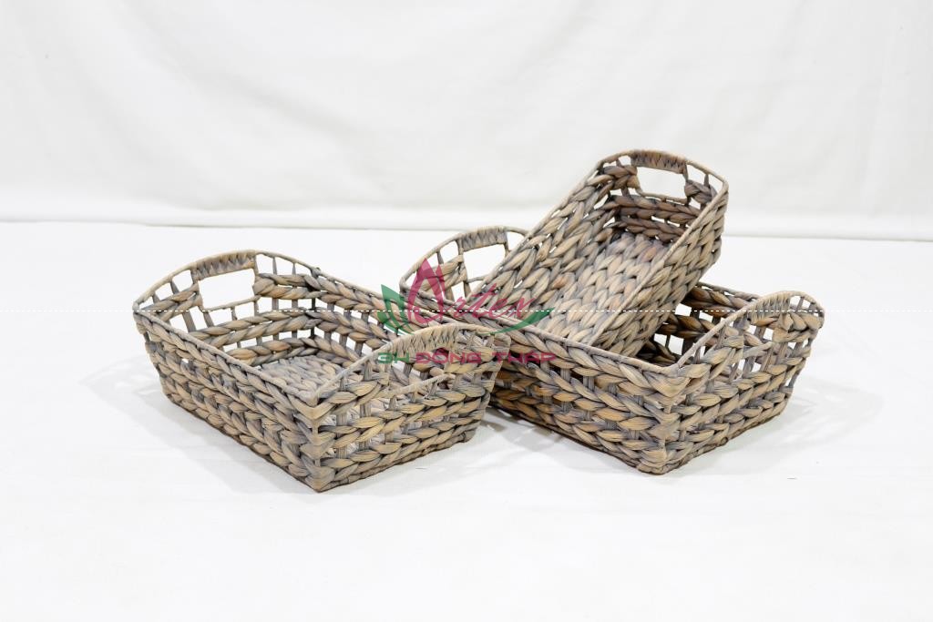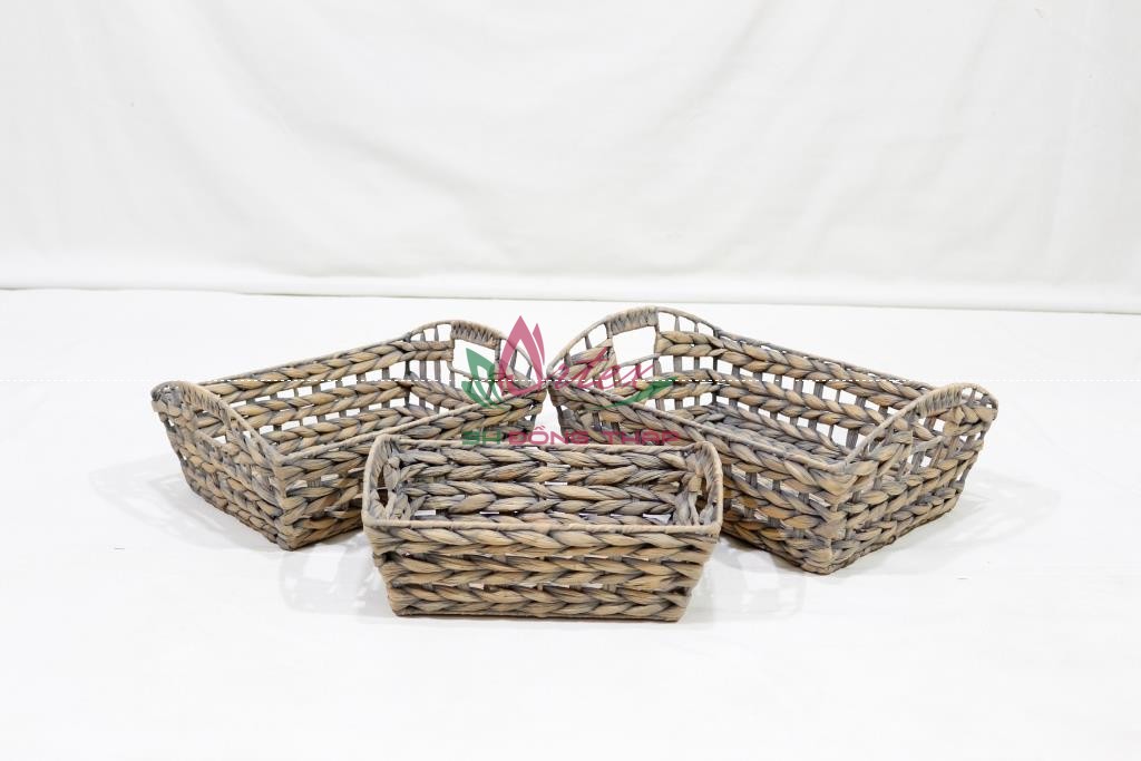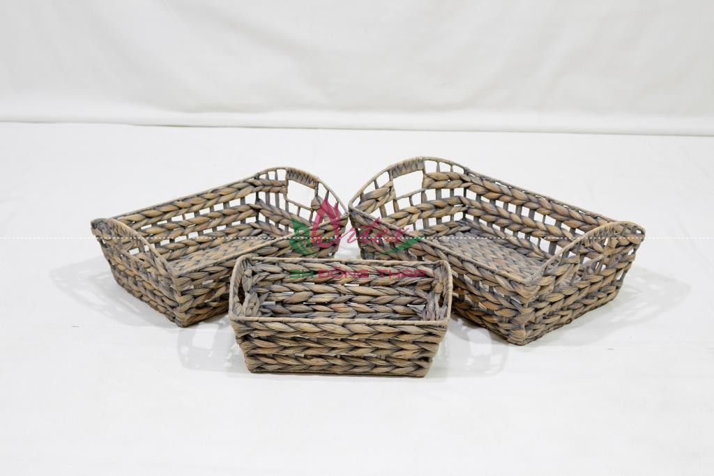 Set of 3 rectangle water hyacinth trays, iron frame with hole handles, open fish bone weave, grey color