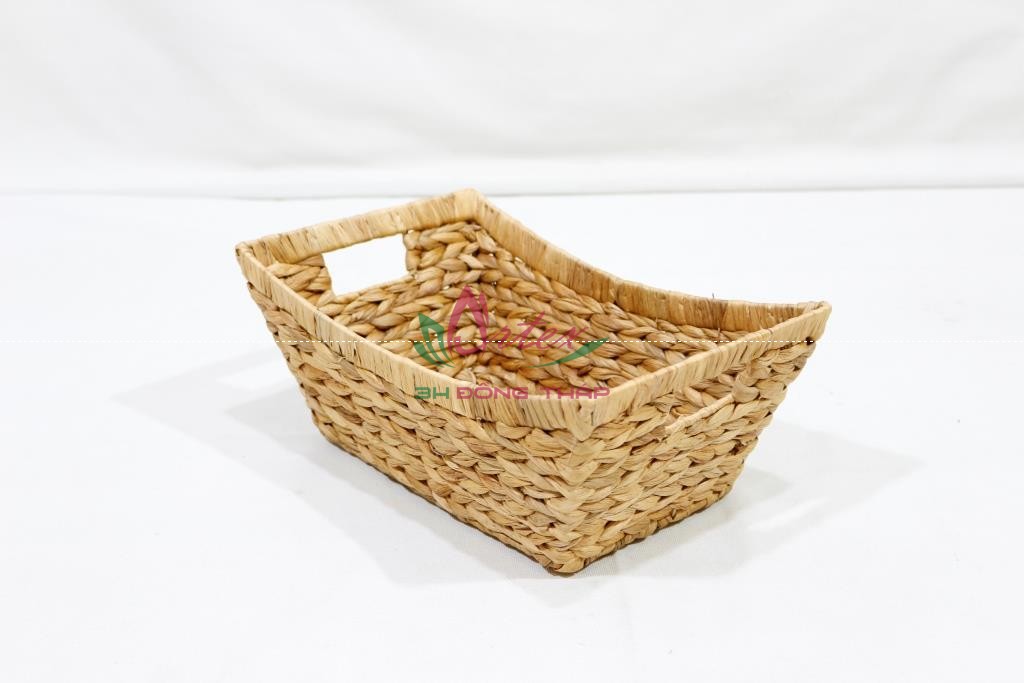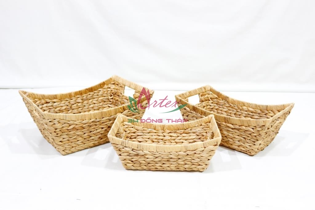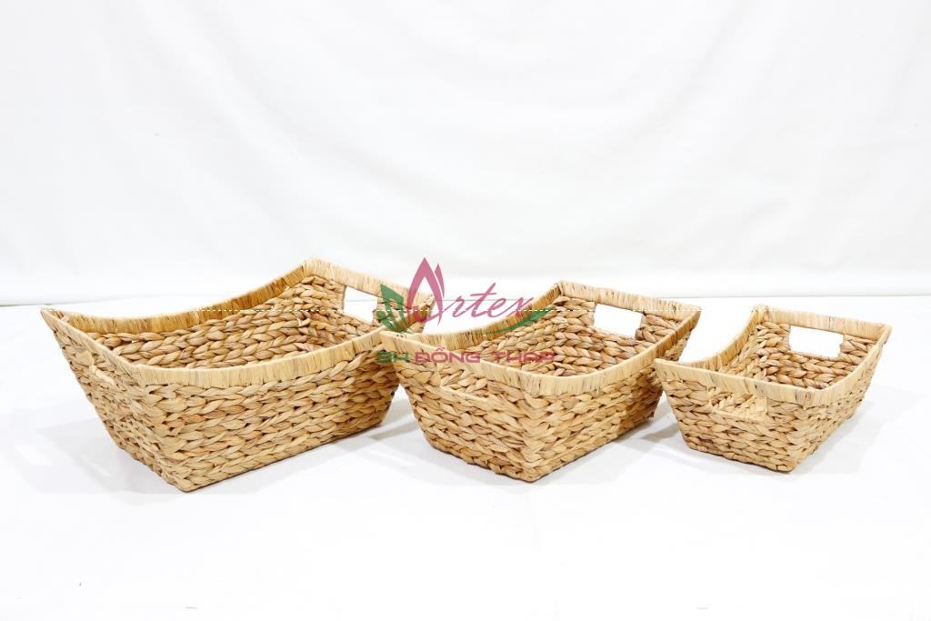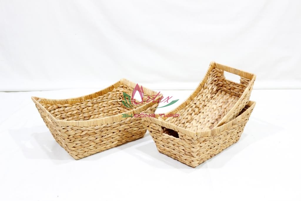 Set of 3 rectangle water hyacinth trays, iron frame with double rim, hole handles, fish bone weave, natural color