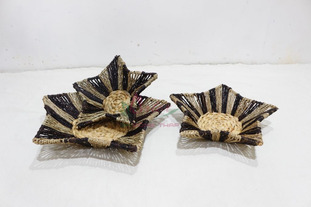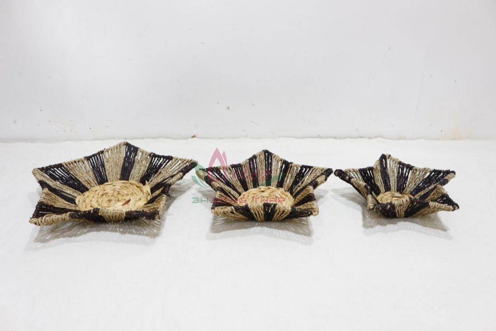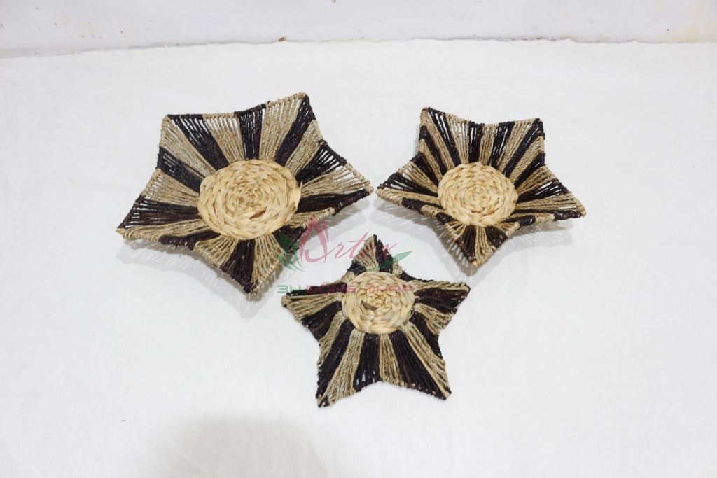 Set of 3 star shape seagrass mix water hyacinth trays, iron frame without handles, rice nut mix normal weave, natural mix black color