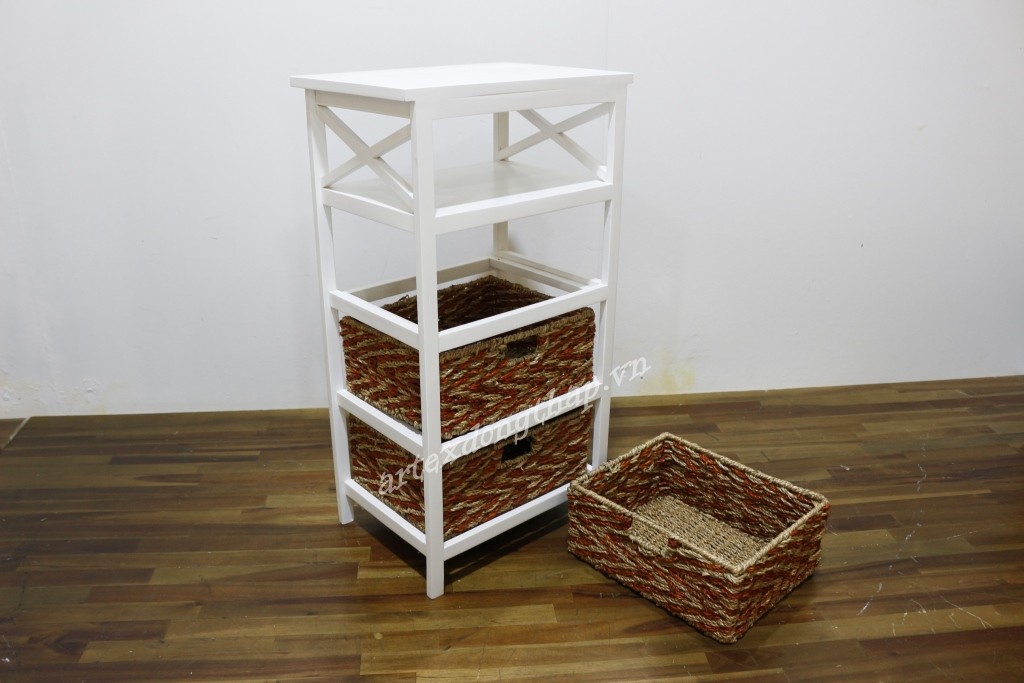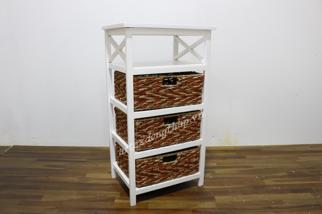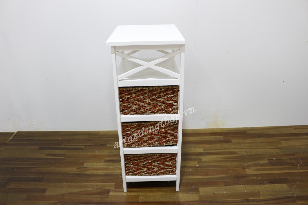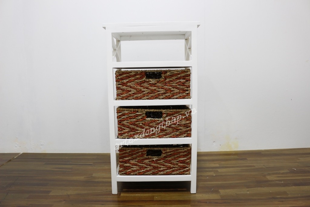 Description: Rect wood cabinet in white color, with 03 seagrass baskets: