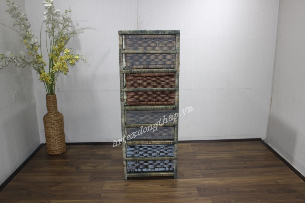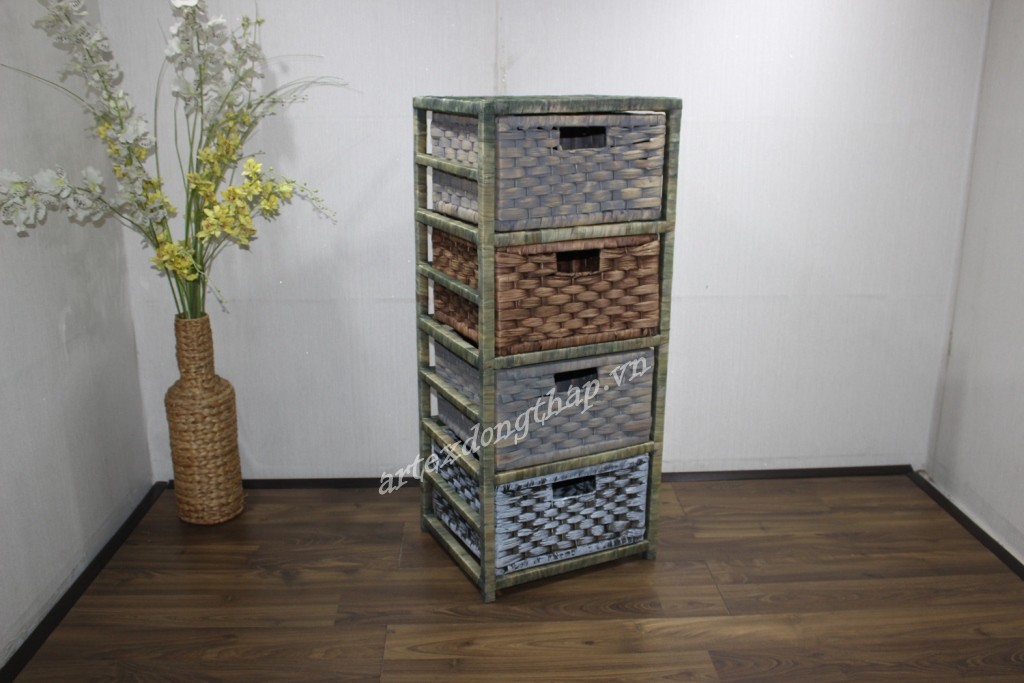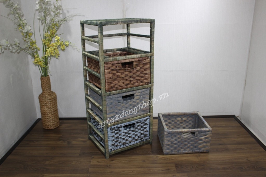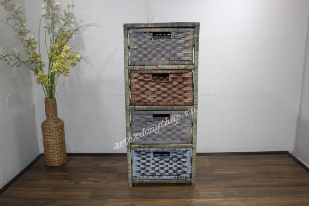 Description: Rect wood cabinet wrapped hyacinth, with 03 baskets: