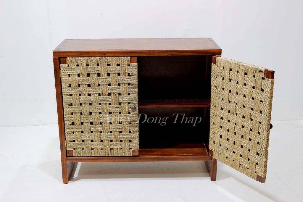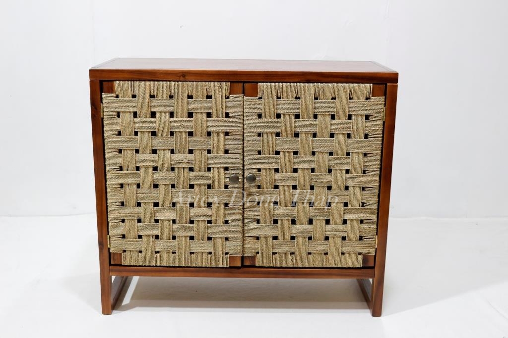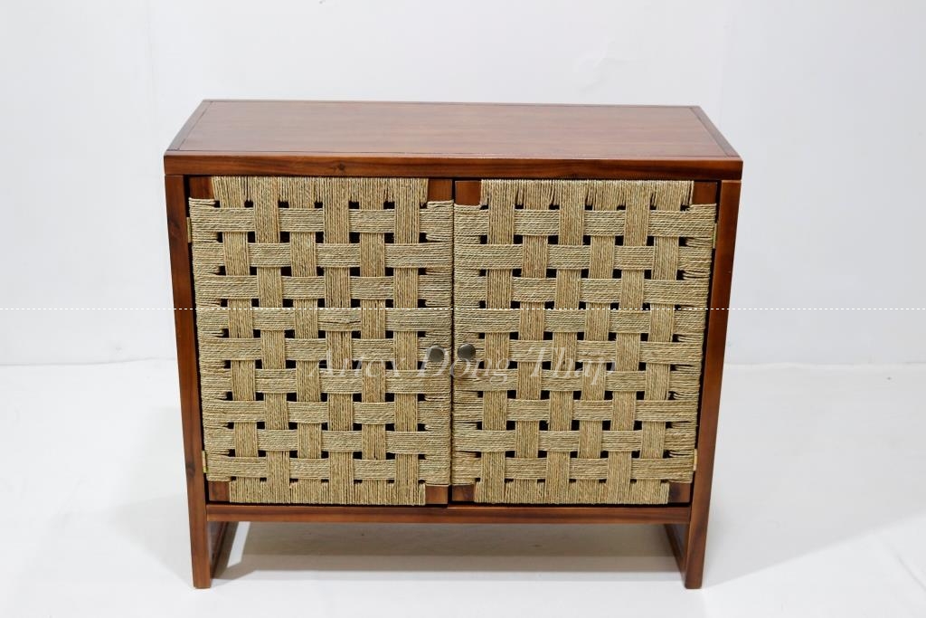 Description: Rect wood cabinet in brown color, with seagrass door