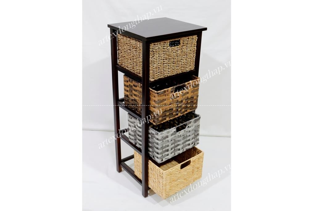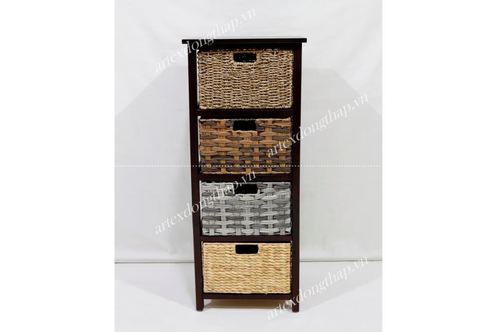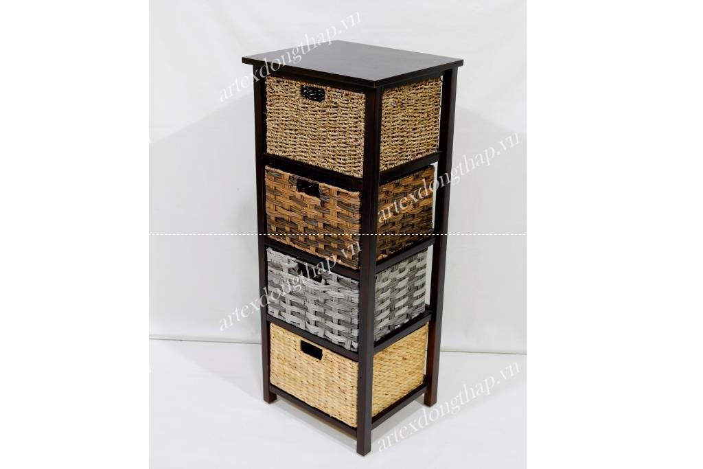 Description: Rect wood cabinet in natural color, with 04 baskets (1 seagrass basket+3 poly rattan basket)